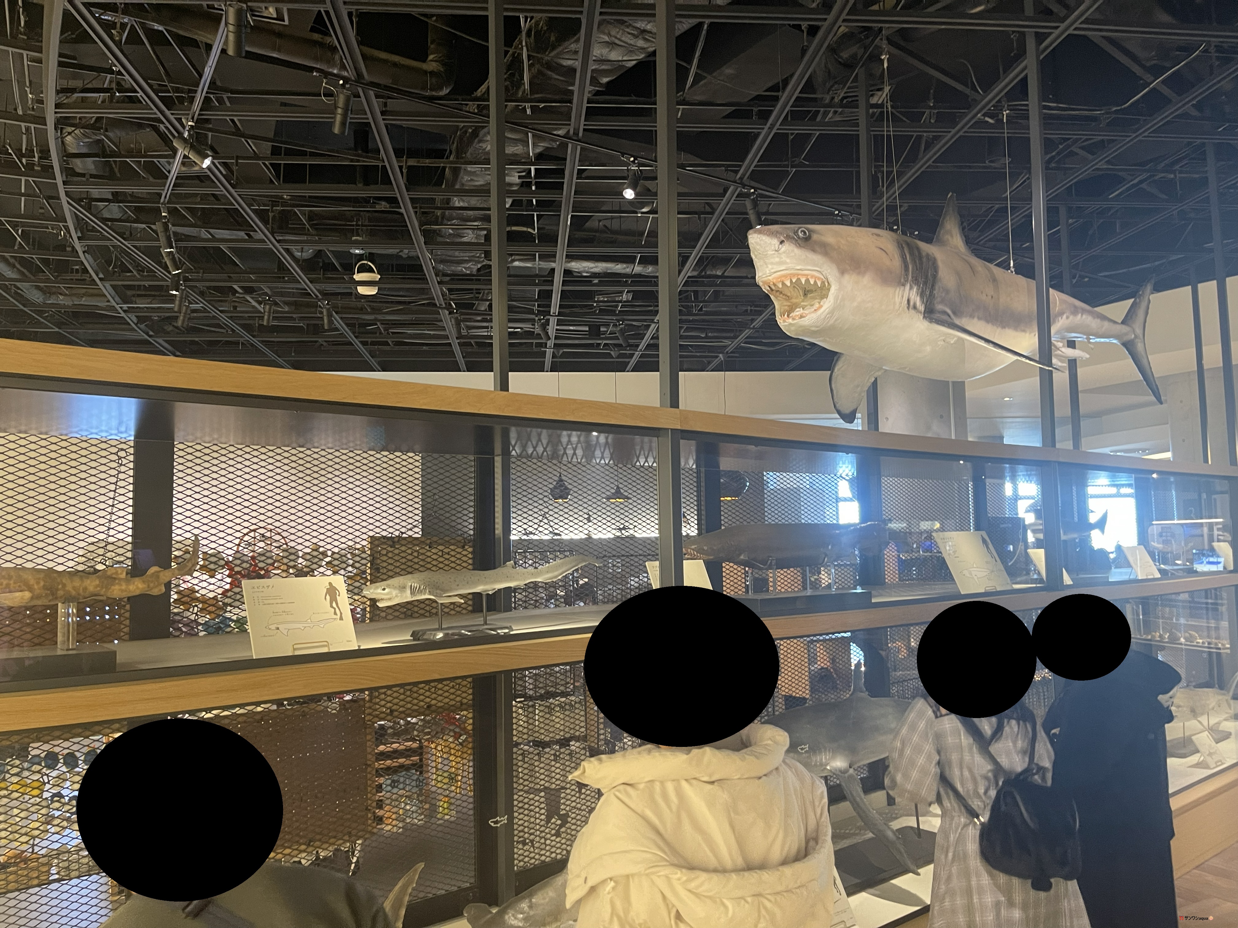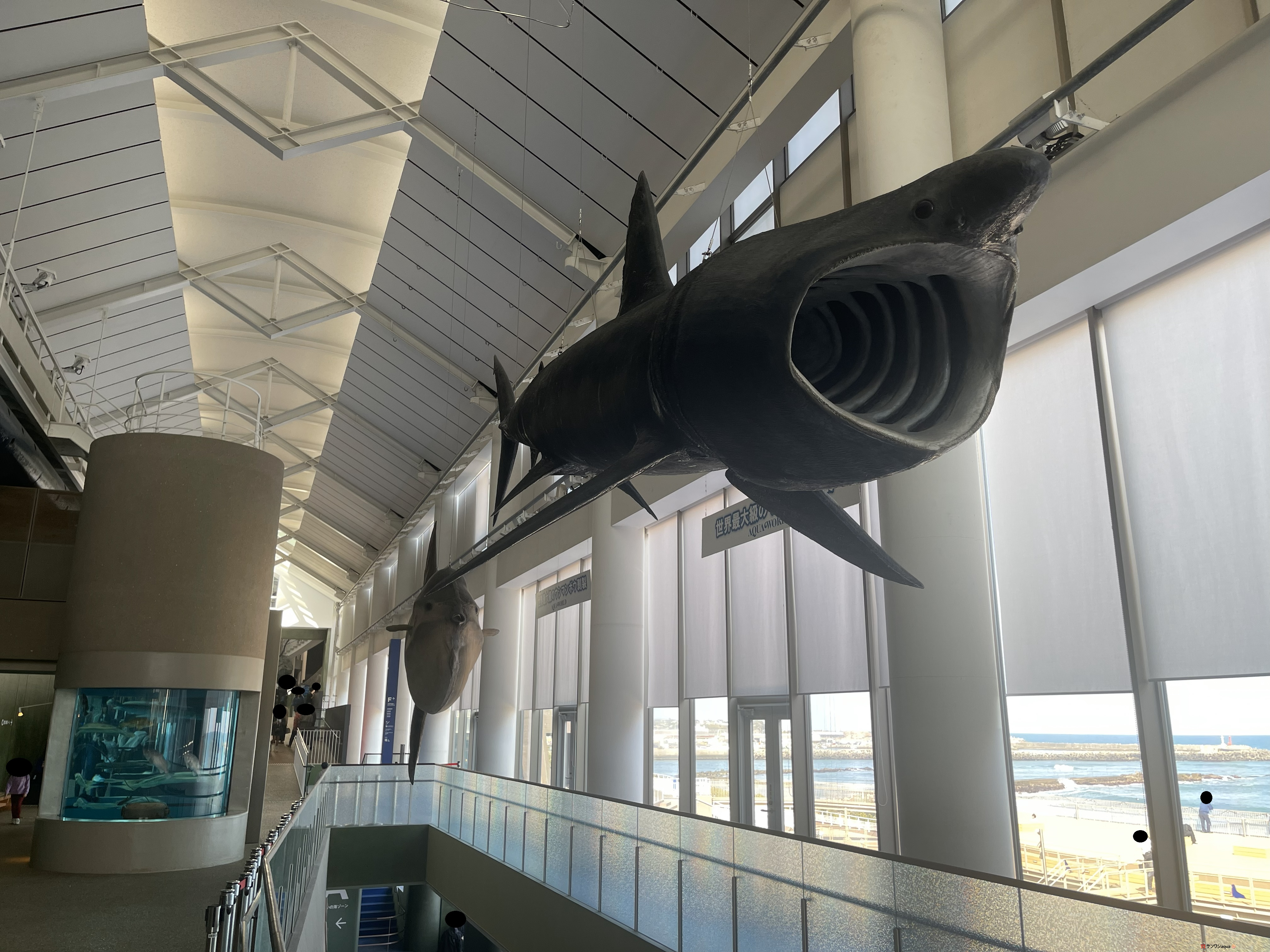 国内で唯一繁殖に成功した全長3.5mを超えるシロワニをはじめ、メガマウスなどの希少サメの標本も展示。