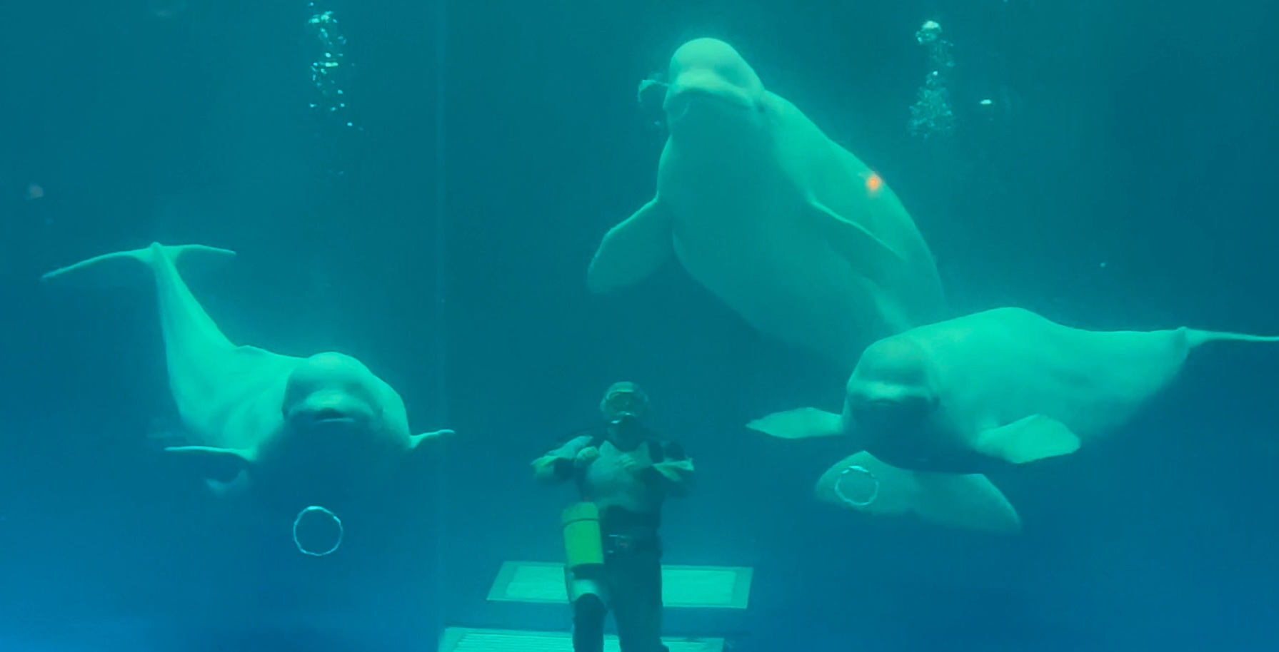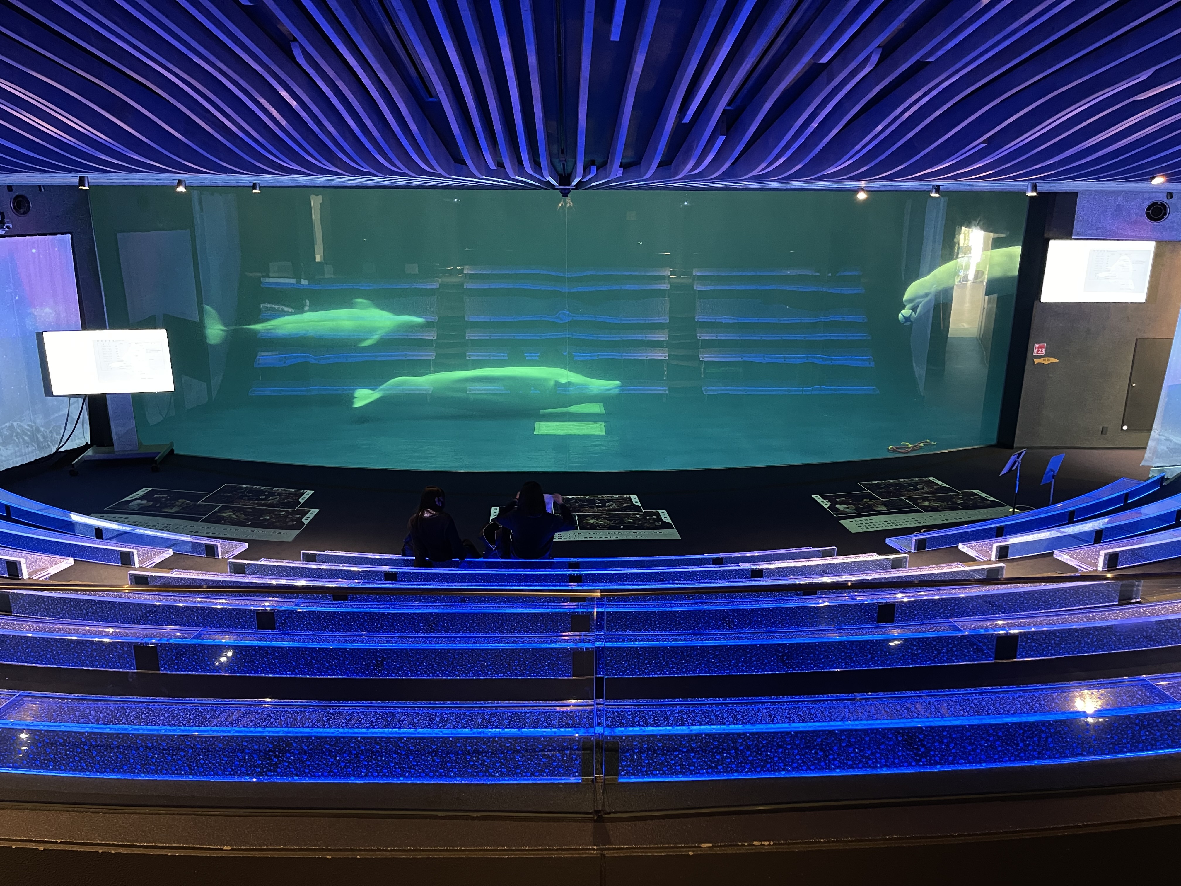 - 西日本で唯一シロイルカを飼育しており、「幸せのバブルリング」パフォーマンスで有名となった。親子による三重リングは必見。