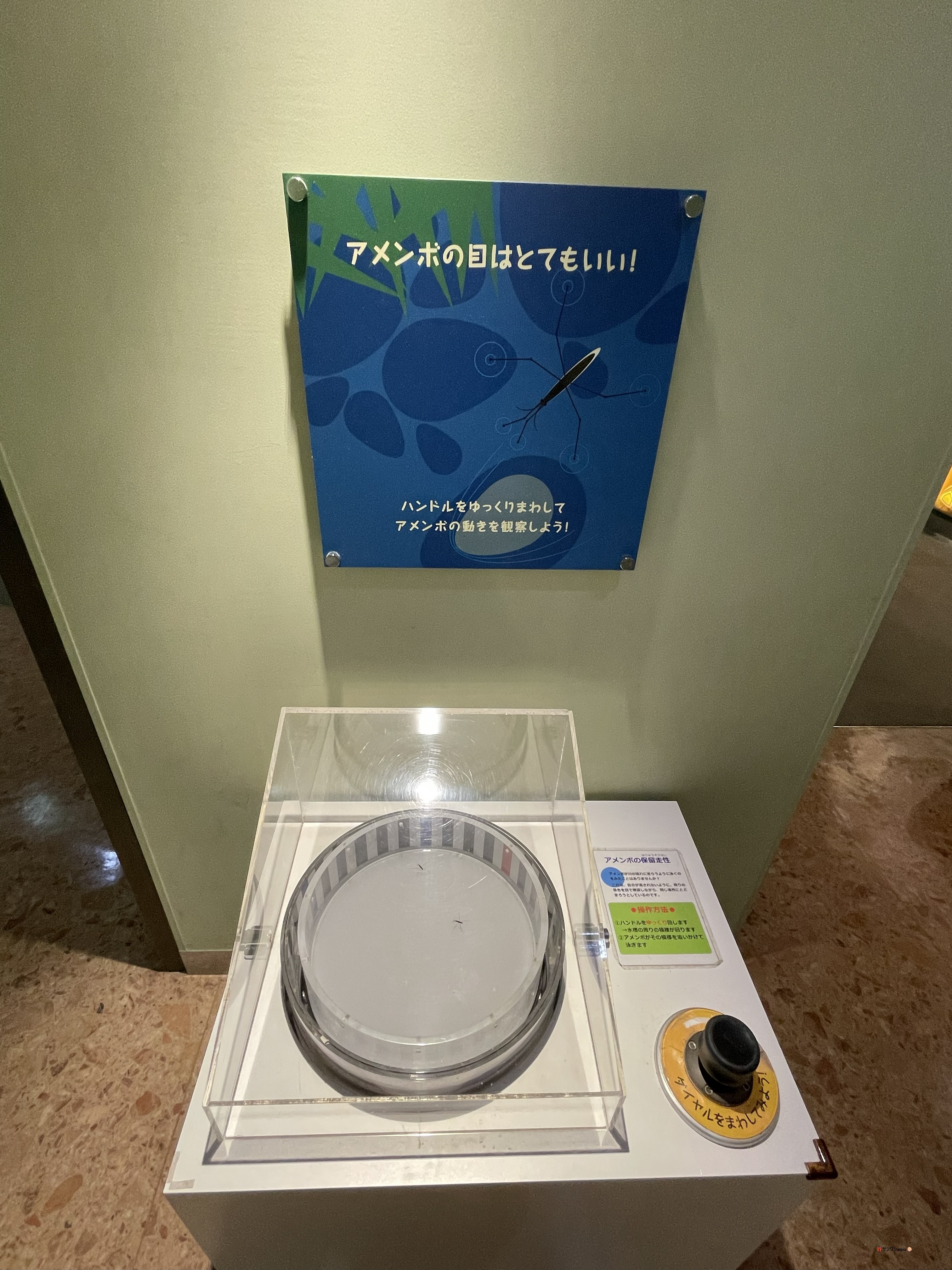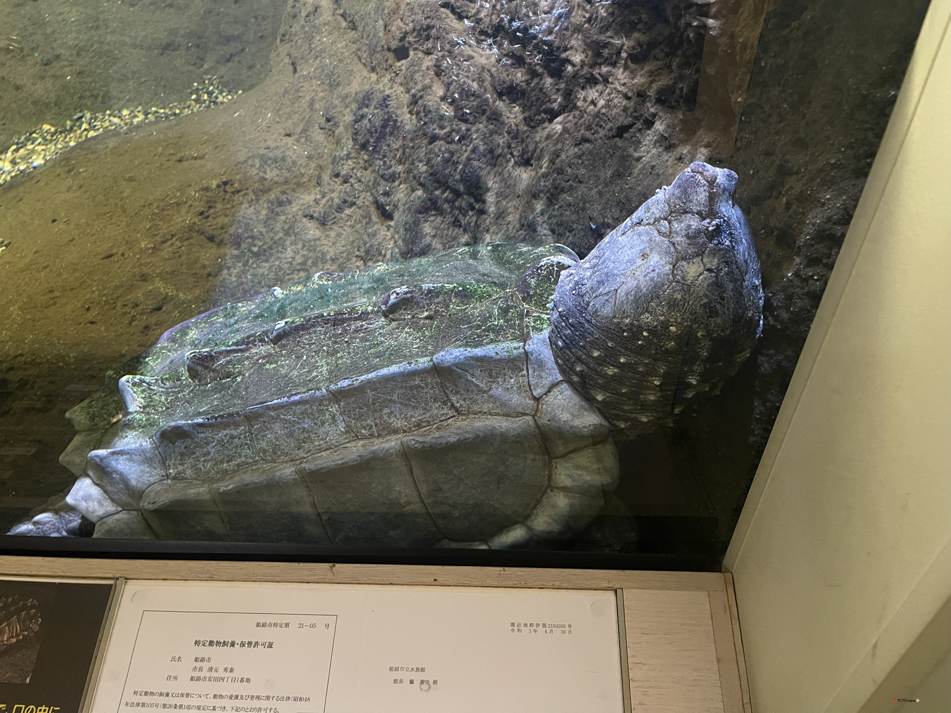 川辺・田んぼに棲む水生昆虫や淡水魚の他に外来種も多く展示する。1984年にニューヨークからやってきたワニガメが大迫力。
