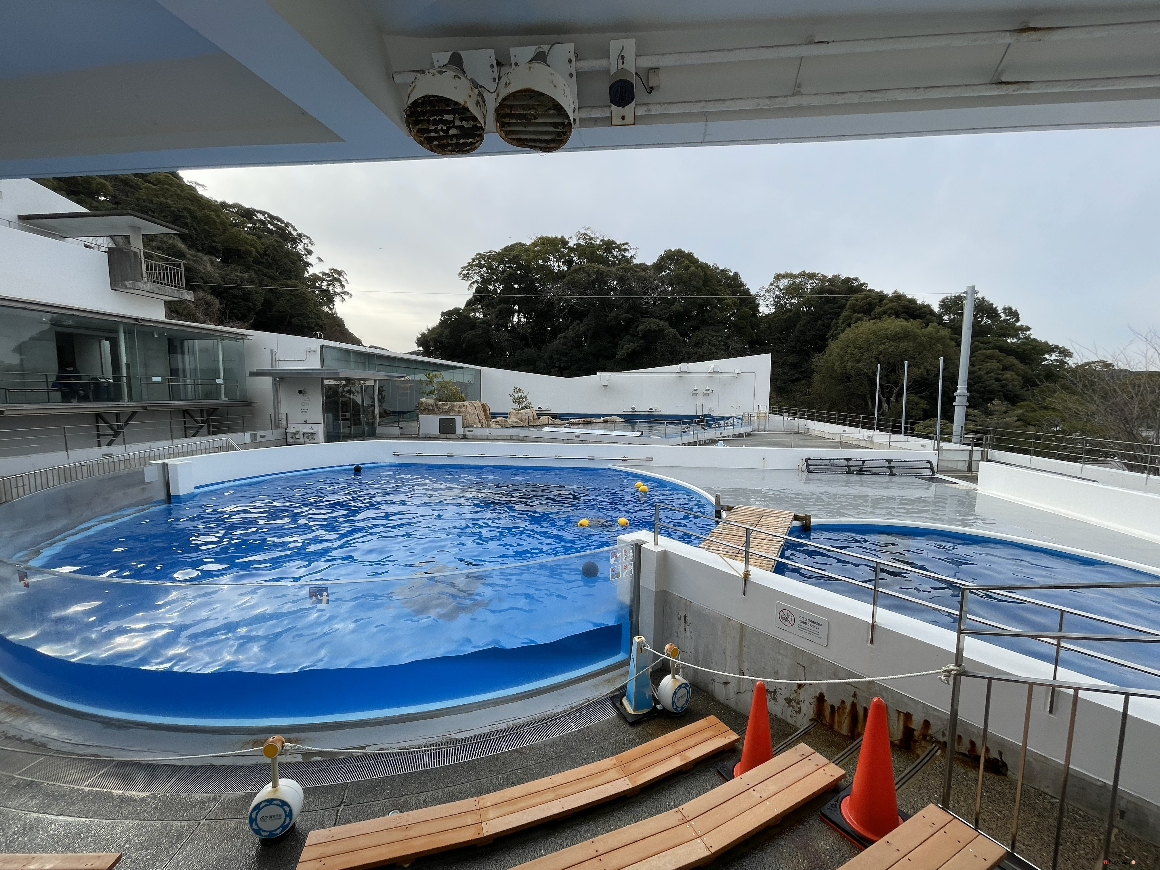 イルカショーは屋上の展望広場から見るのもオススメ。入り口が分かりにくいので要確認。