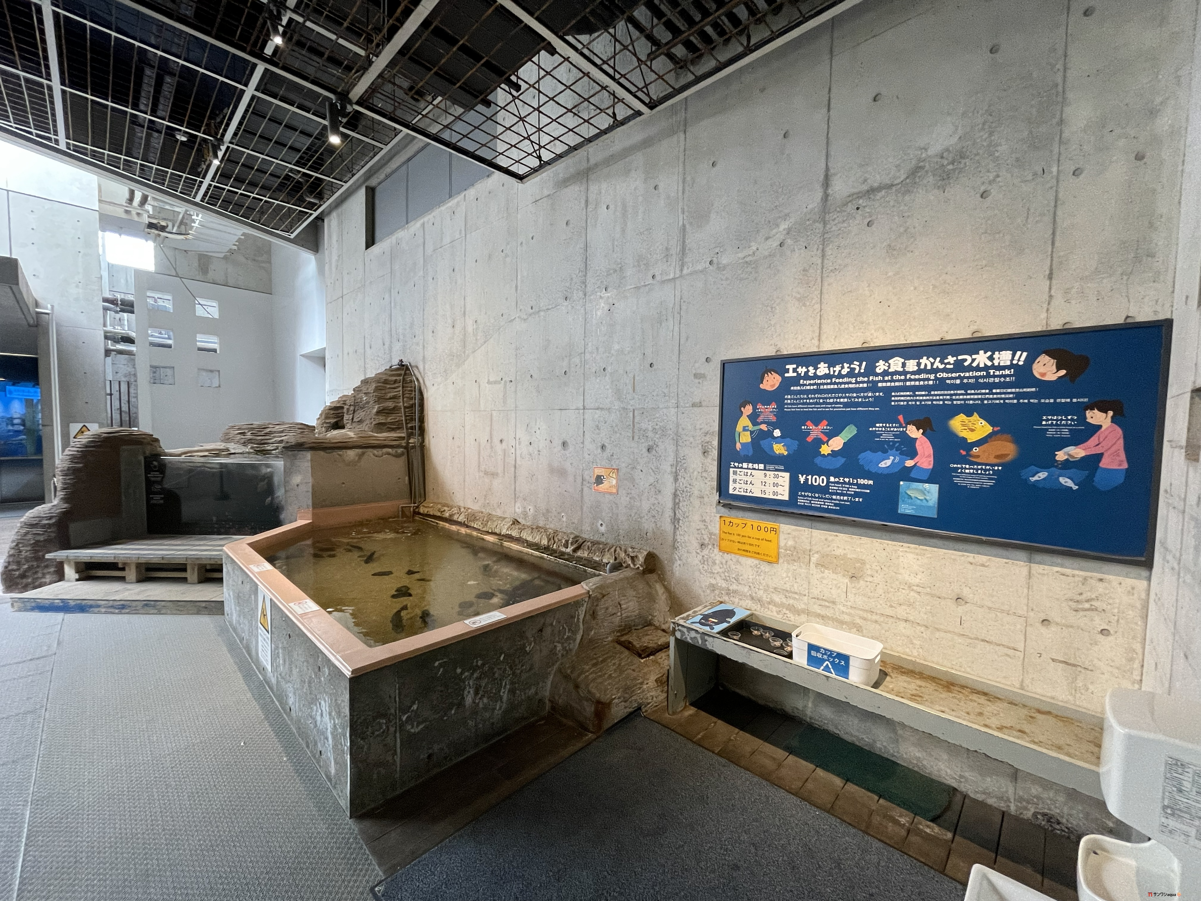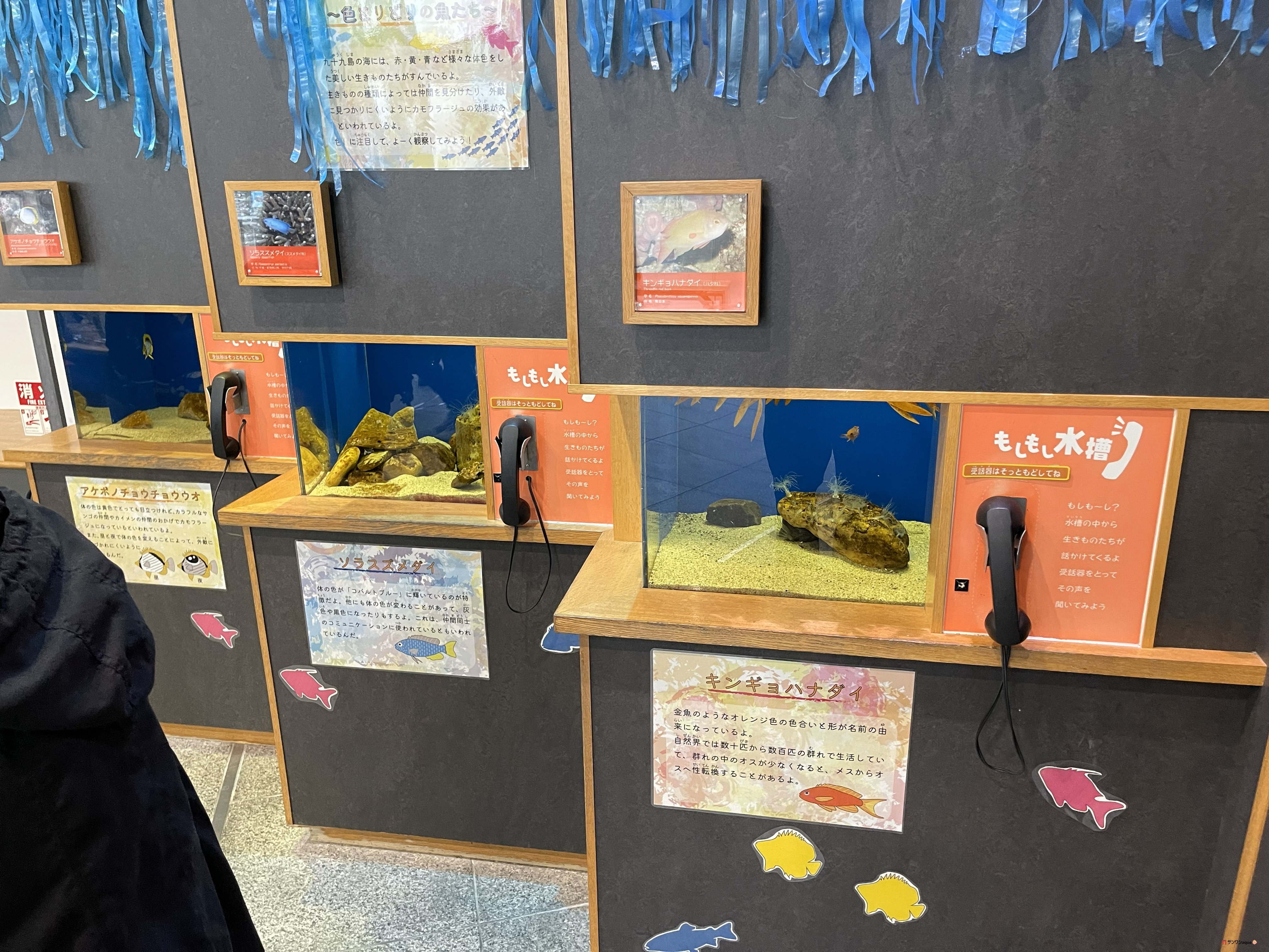 キッズスペース「こども広場あまもば」やタッチング水槽、本革刻印など体験系展示も充実。