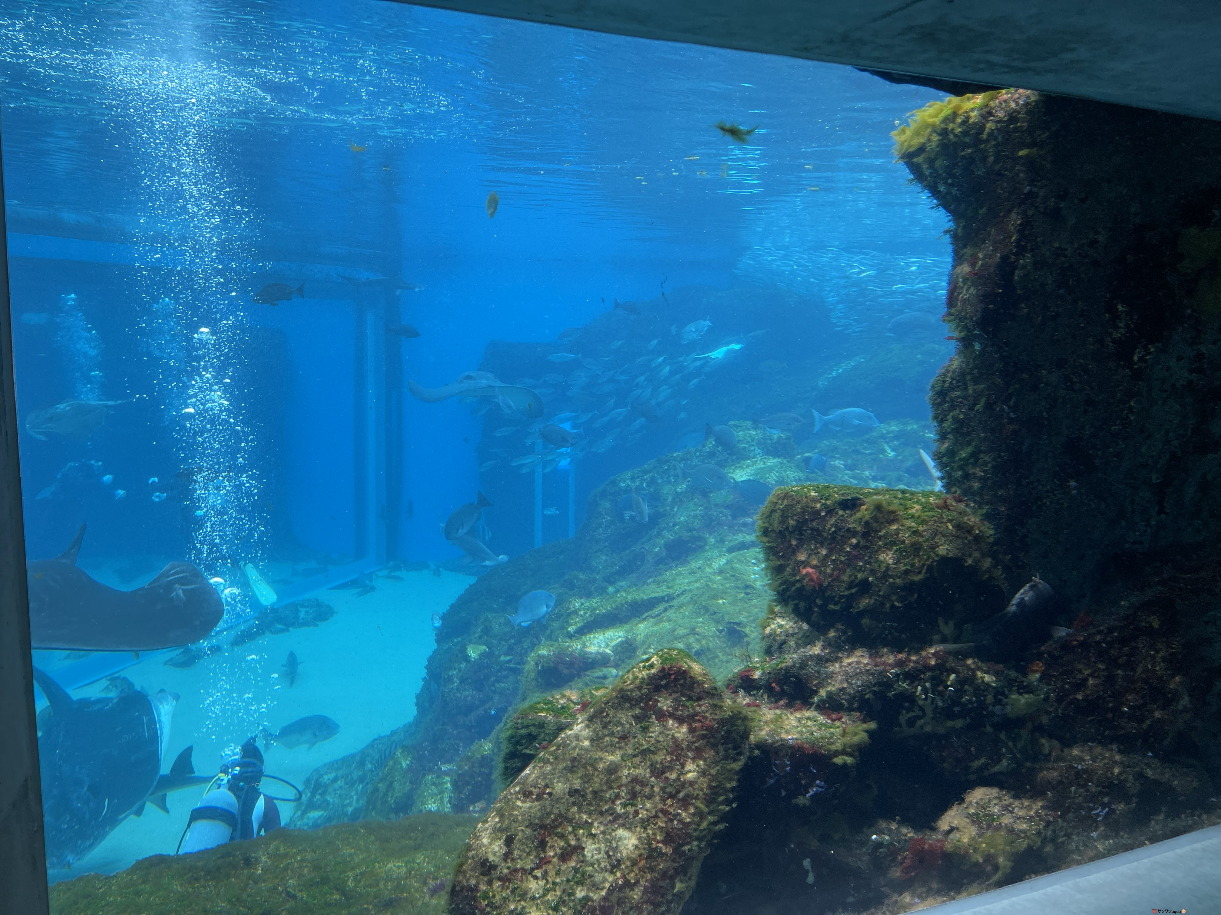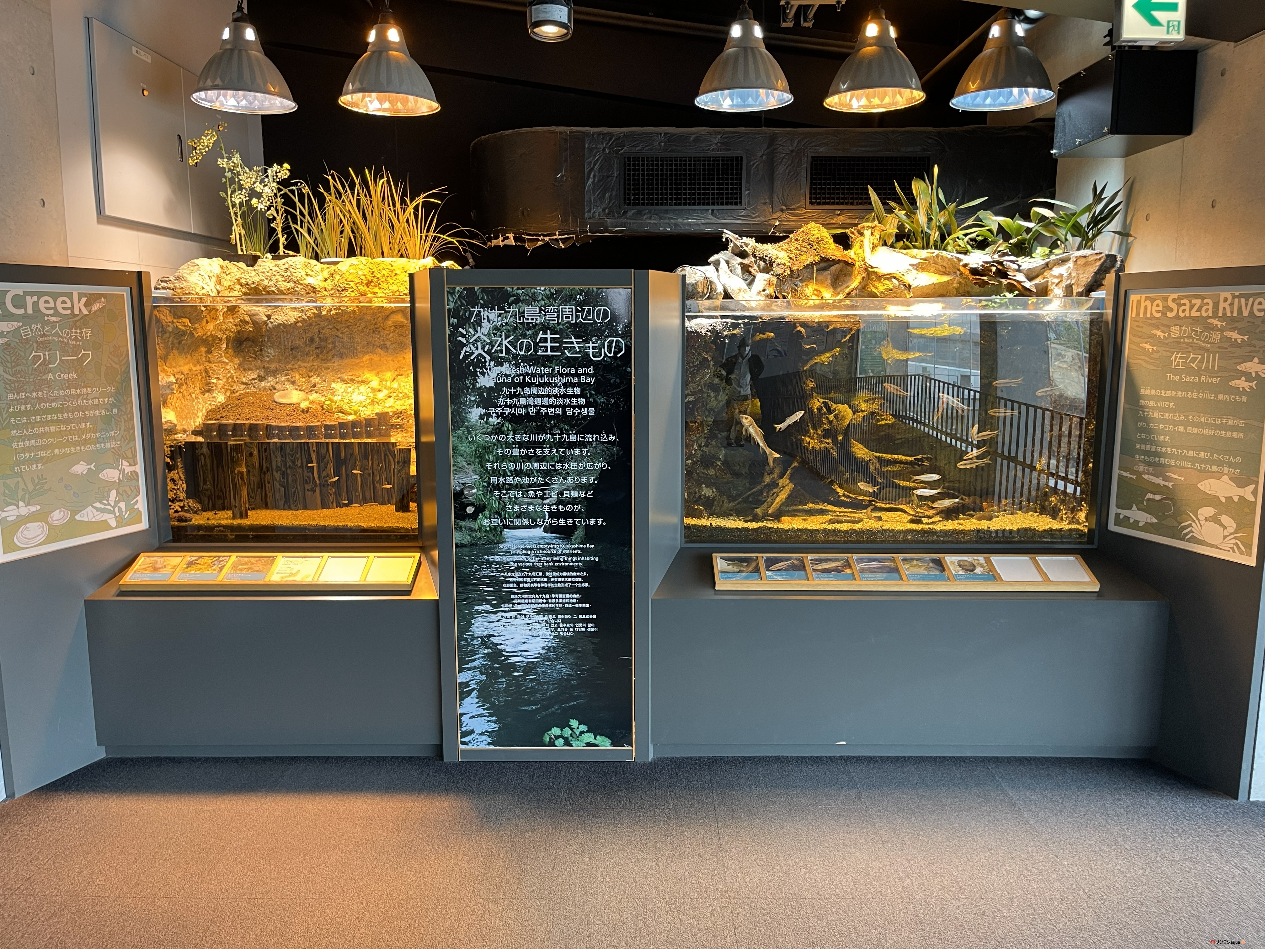 メイン展示『九十九島湾大水槽』は屋外型大水槽で、自然光を取り入れた柔らかな光で九十九島の海中世界をリアルに再現している。