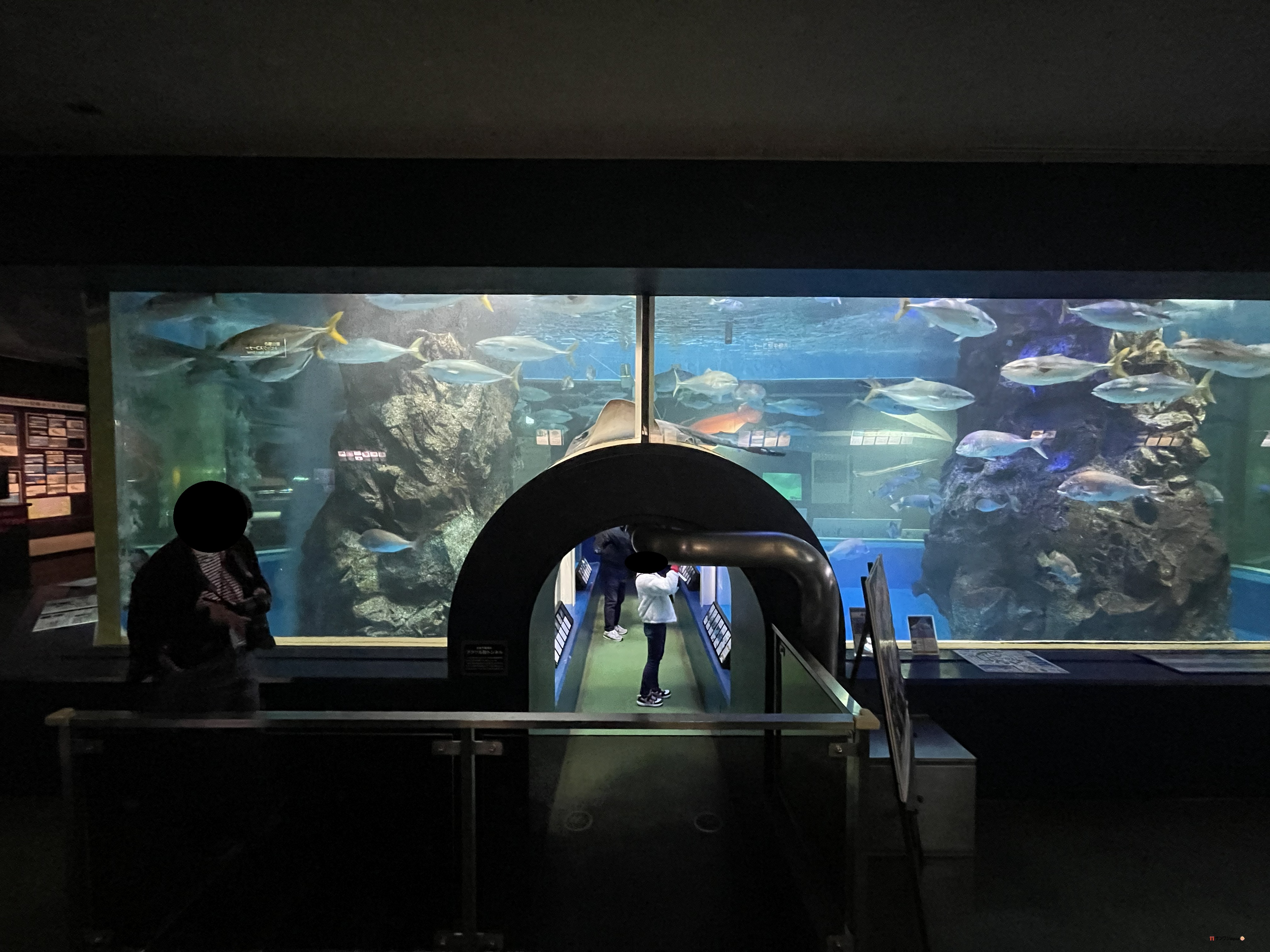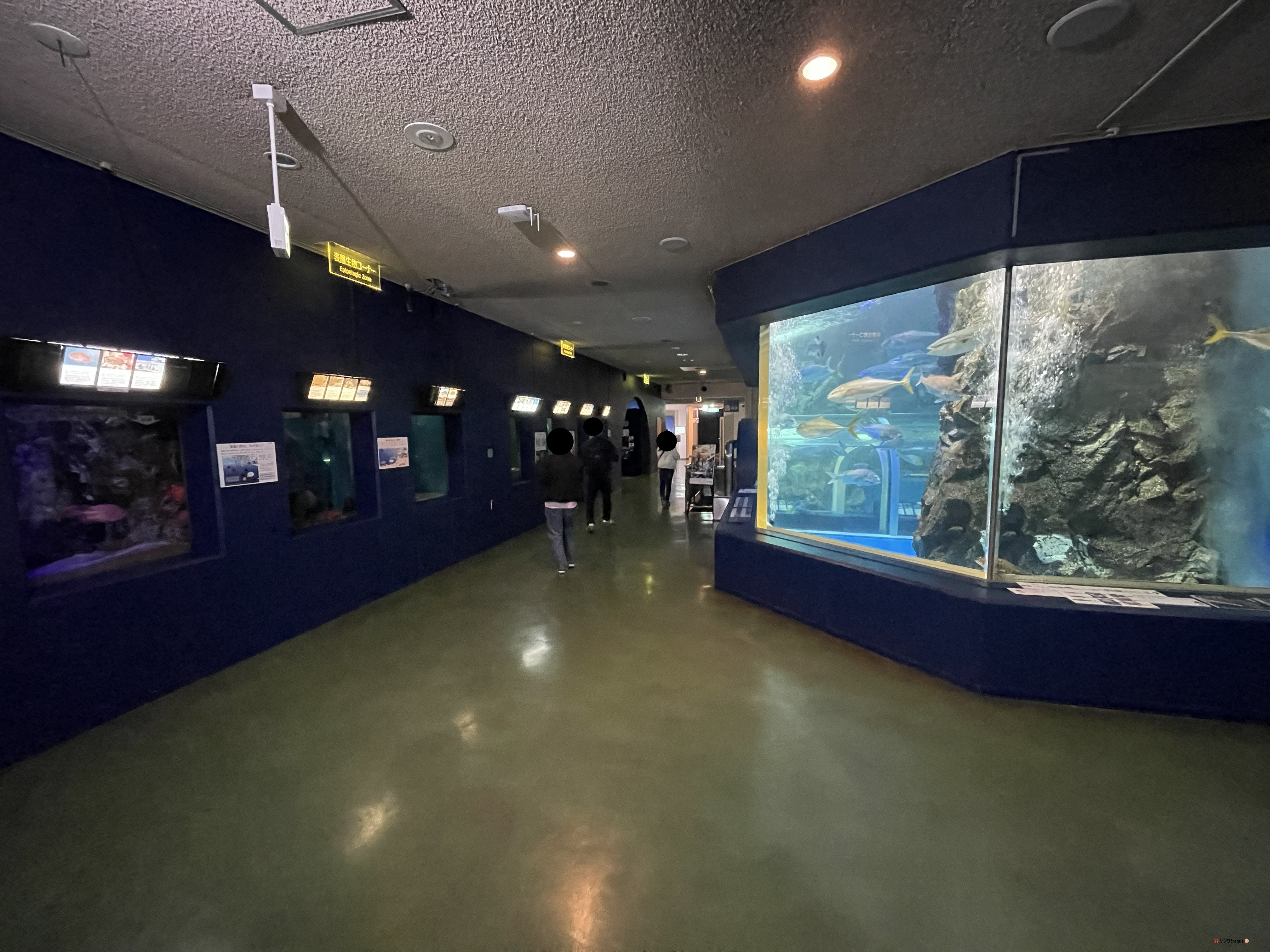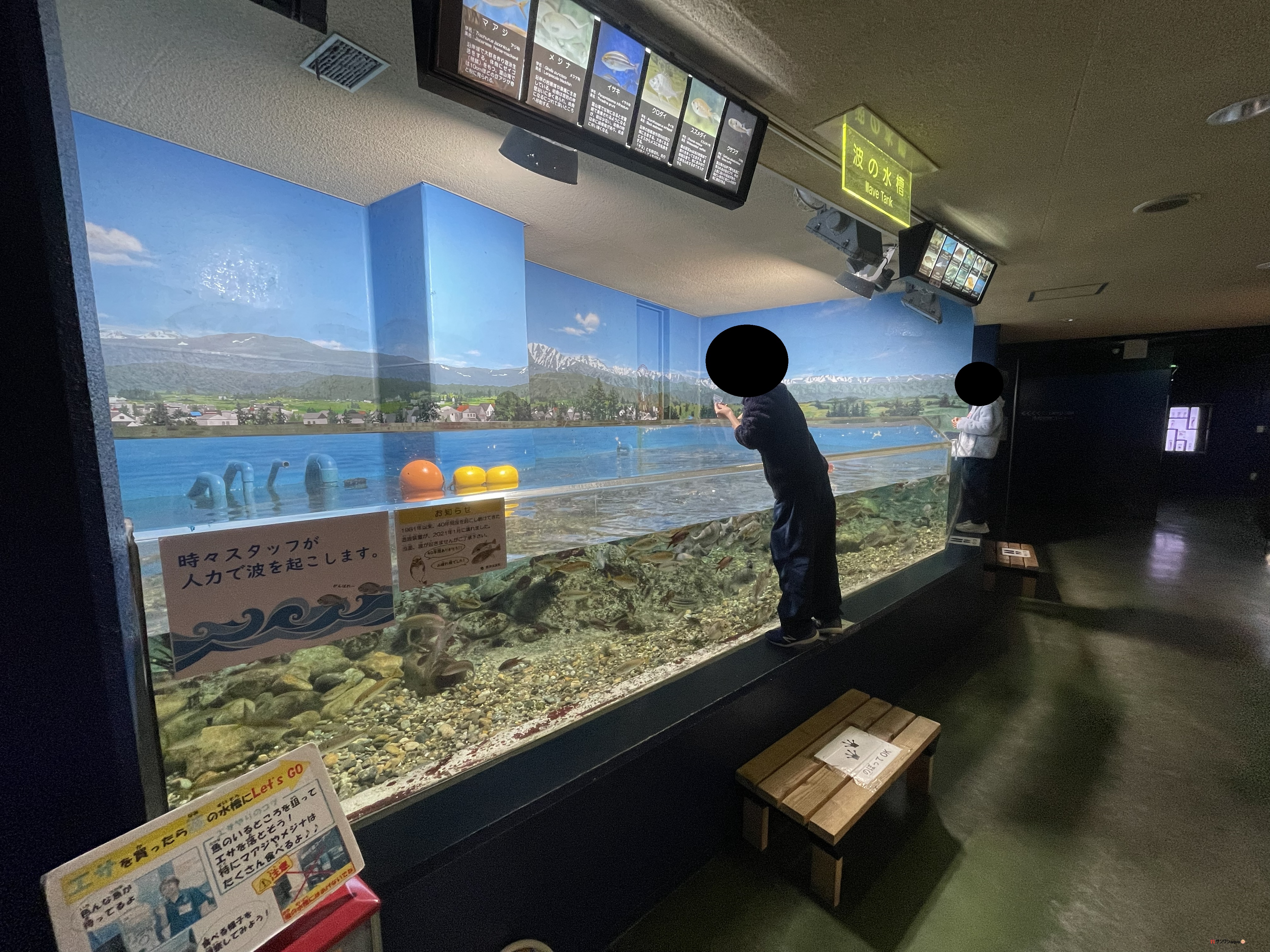 『表層生物コーナー』では小型の回遊魚が泳ぐ姿や餌やりを楽しめる。なお造波装置は故障していて、偶に人力で出している。