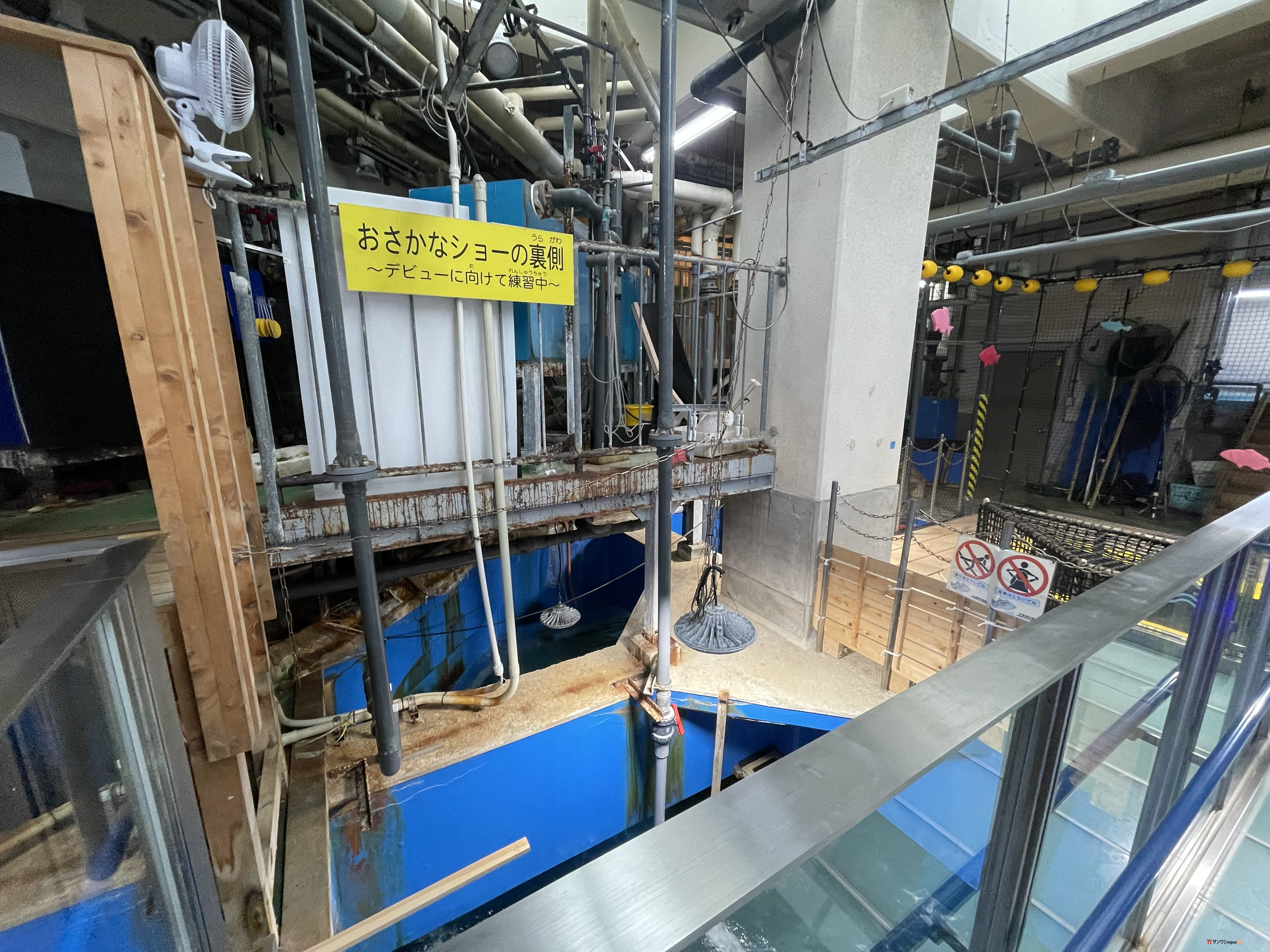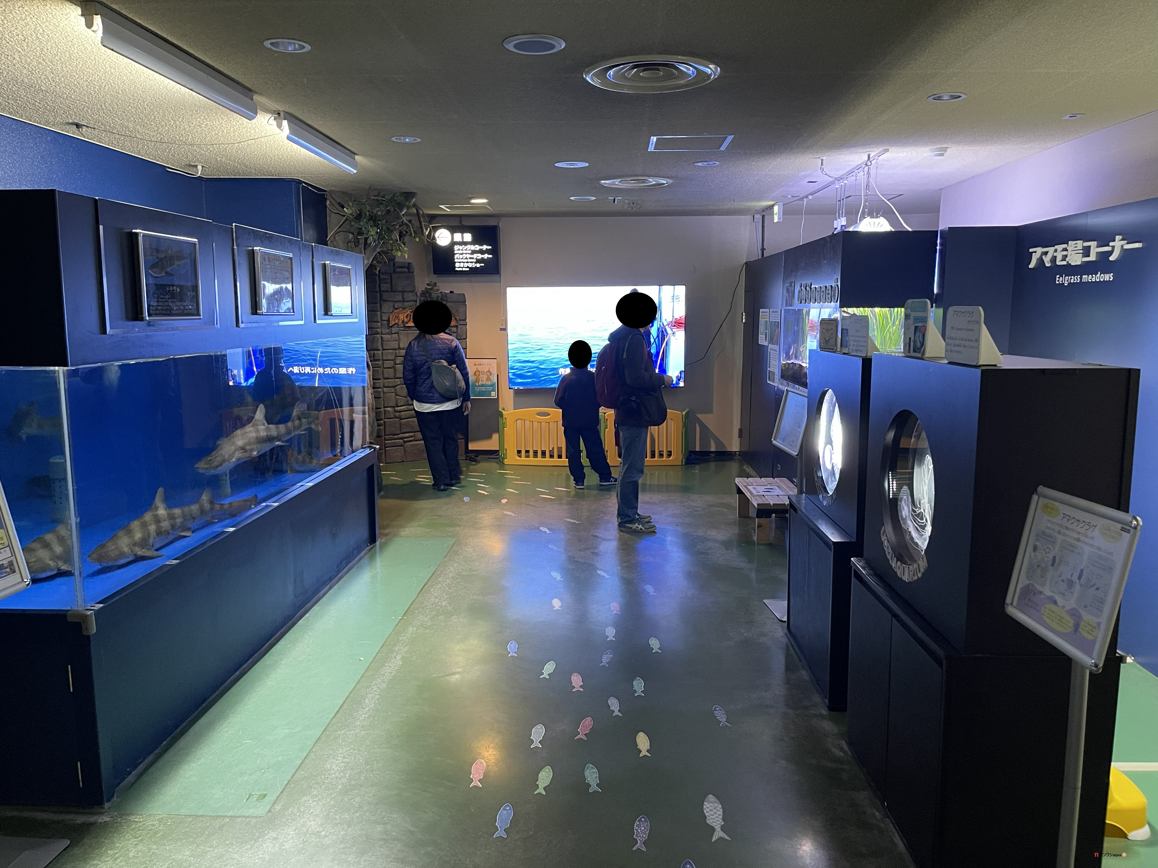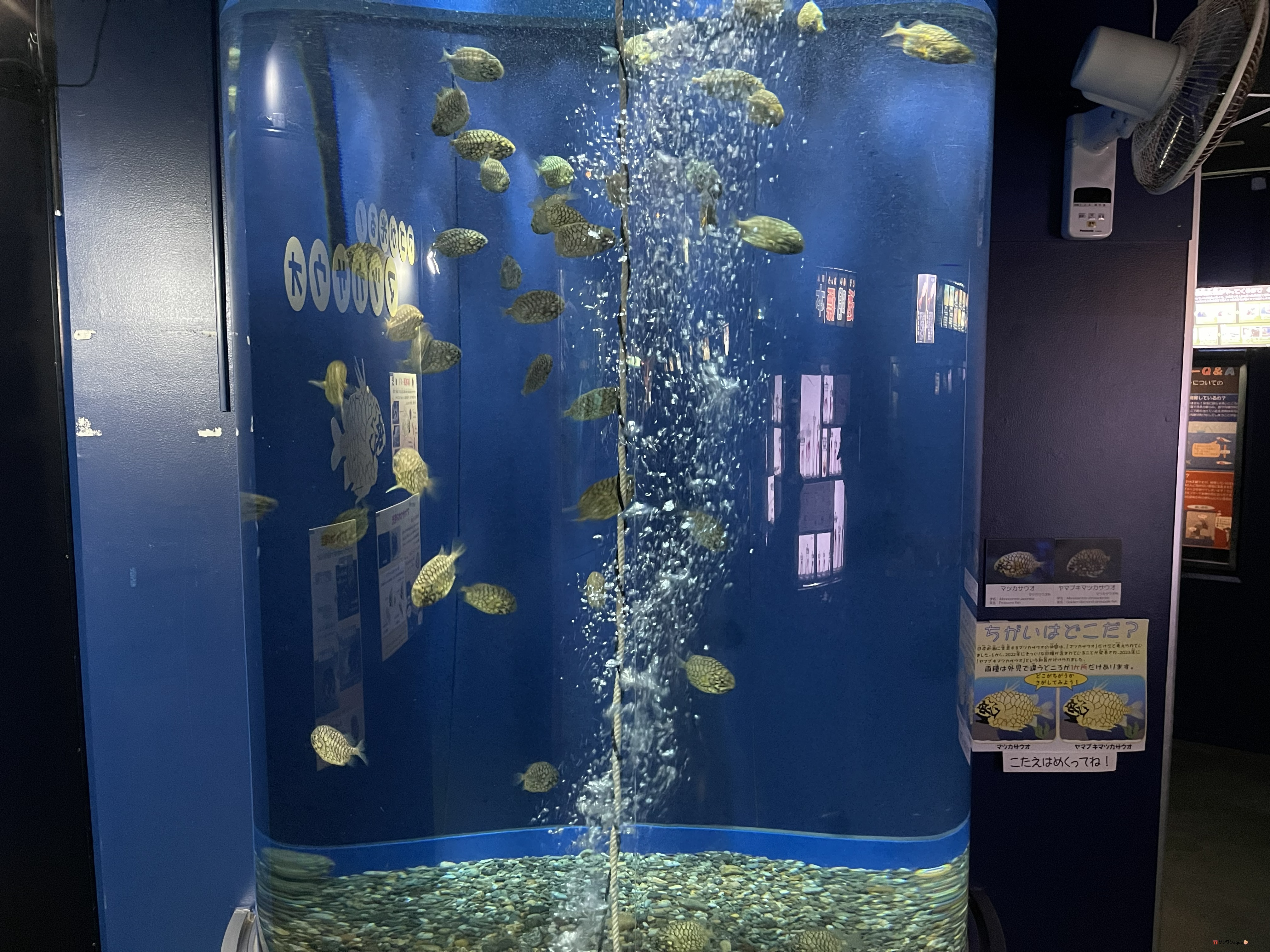 『表層生物コーナー』では小型の回遊魚が泳ぐ姿や餌やりを楽しめる。なお造波装置は故障していて、偶に人力で出している。