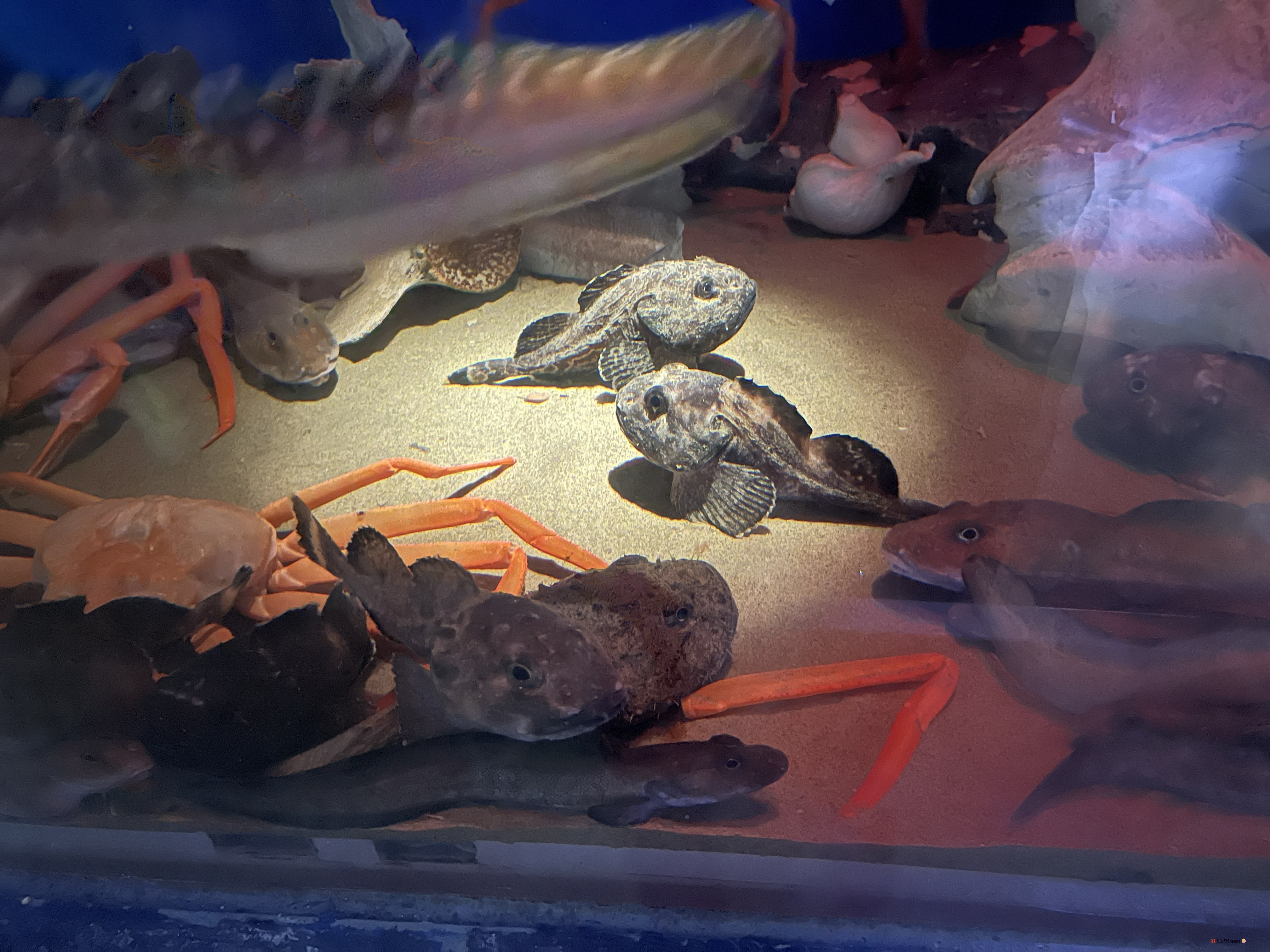 『深海生物コーナー』では地元や駿河湾の深海魚を展示。水槽内で特定のスポットが短時間だけ明るくなるので観やすい。