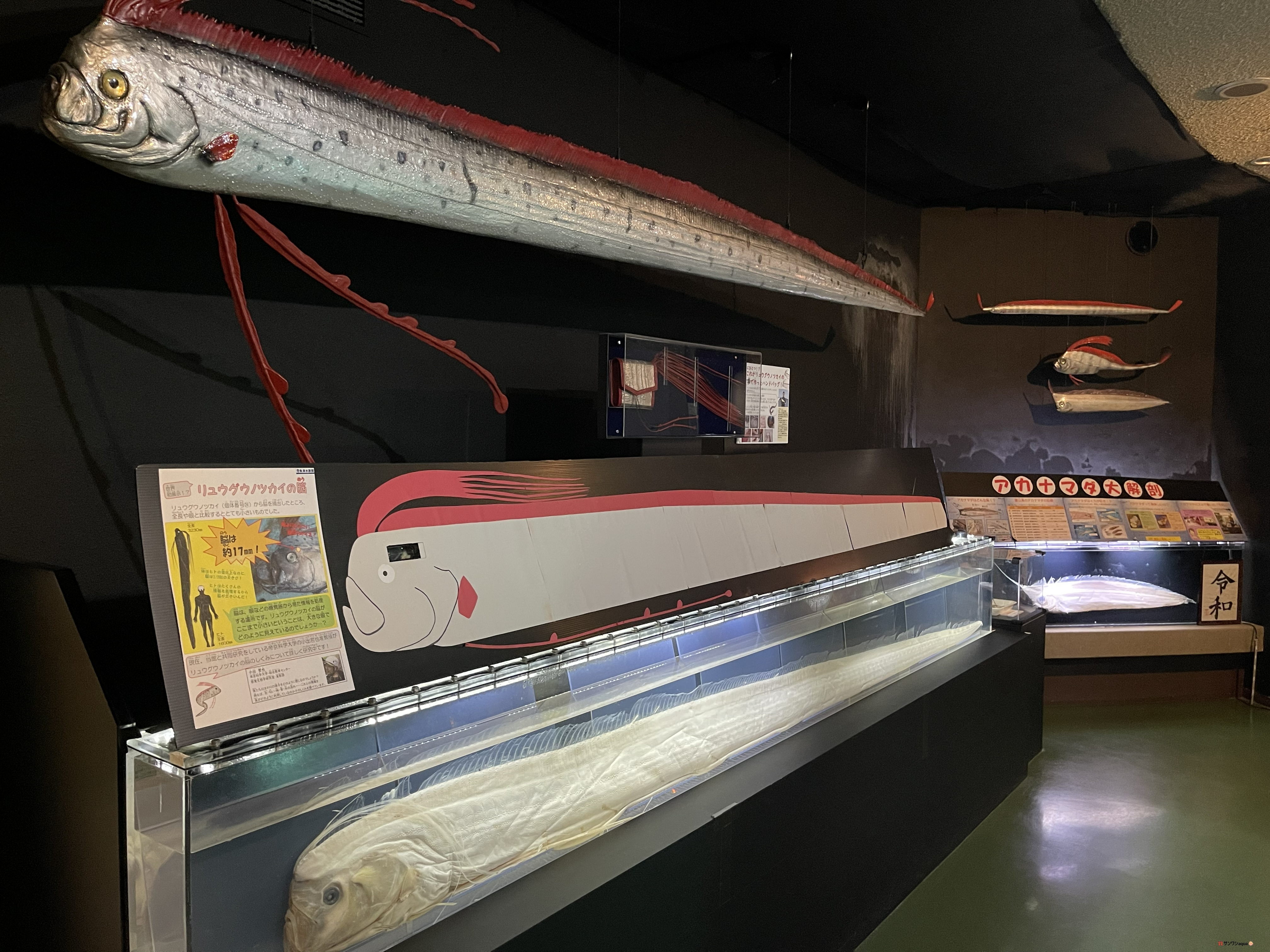 富山湾はリュウグウノツカイが漂着する事が多く資料が豊富。生きて展示していた際の映像も観れる。