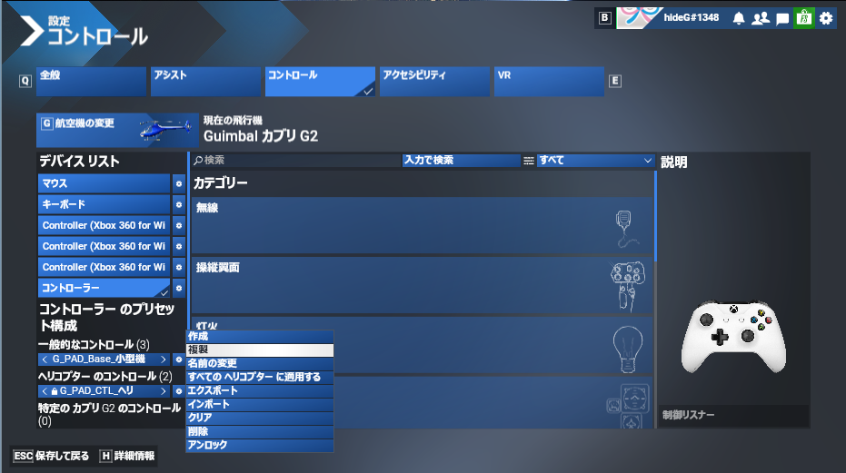 先に作っていた「G_PAD_CTL_小型機」を複製し、名前の変更で「G_PAD_CTL_ヘリ」にします。