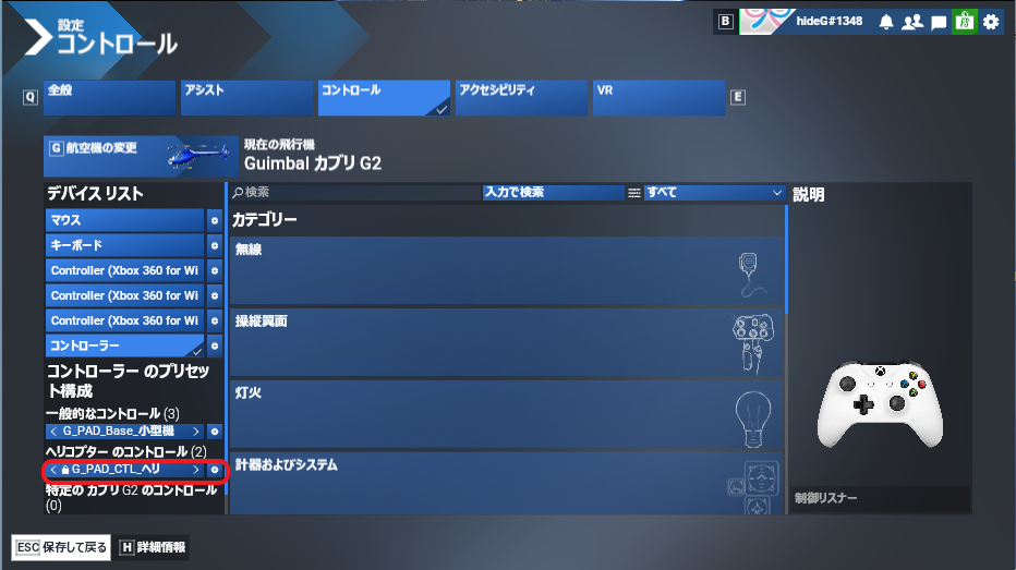 ダウンロードしたファイルを解凍し、「G_PAD_CTL_ヘリ.xml」をMSFS2024のコントローラー設定で
