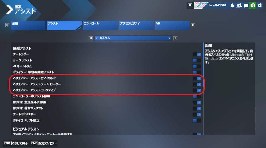 「設定」→「アシスト」→「ヘリコプター:アシストテールローター」→「オン」に設定する。