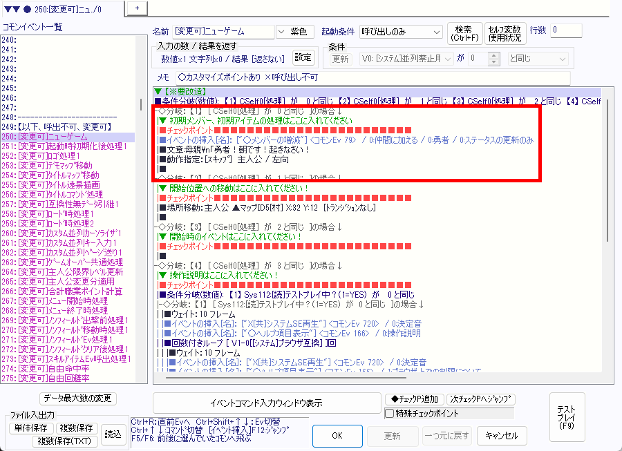 まず、コモンイベント「[変更可]ニューゲーム」の以下の場所にイベントを設置する