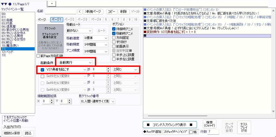 先ほど設置した自動実行イベントを開き、以下の場所にイベントを挿入します。
