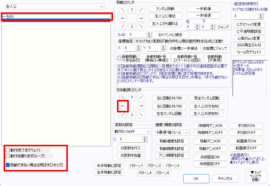 テストプレイした所、主人公が正面を向いてるので、まずは暗転中に向きを変更します。