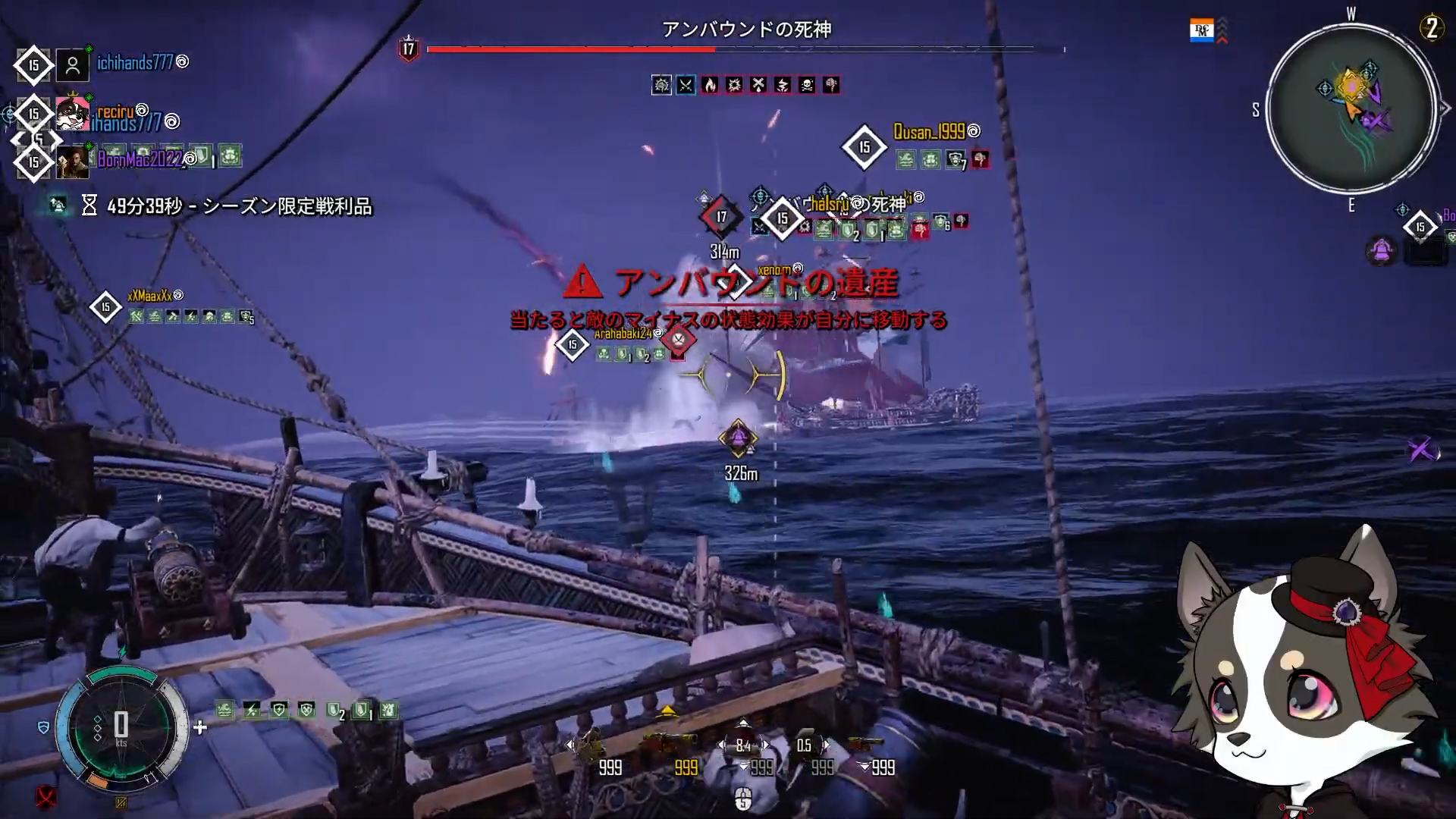 「アンバウンドの遺産」を喰らうと、多数(5~7個)のデバフがかかってすぐに沈没してしまうので、イベントボスの臼砲を避けながら復元道具やポセイドンの酒で除去しよう。