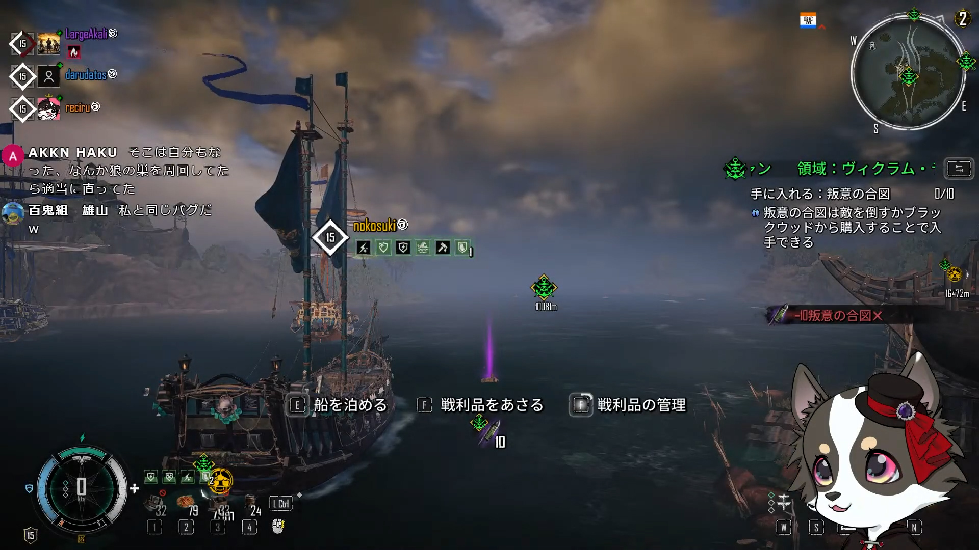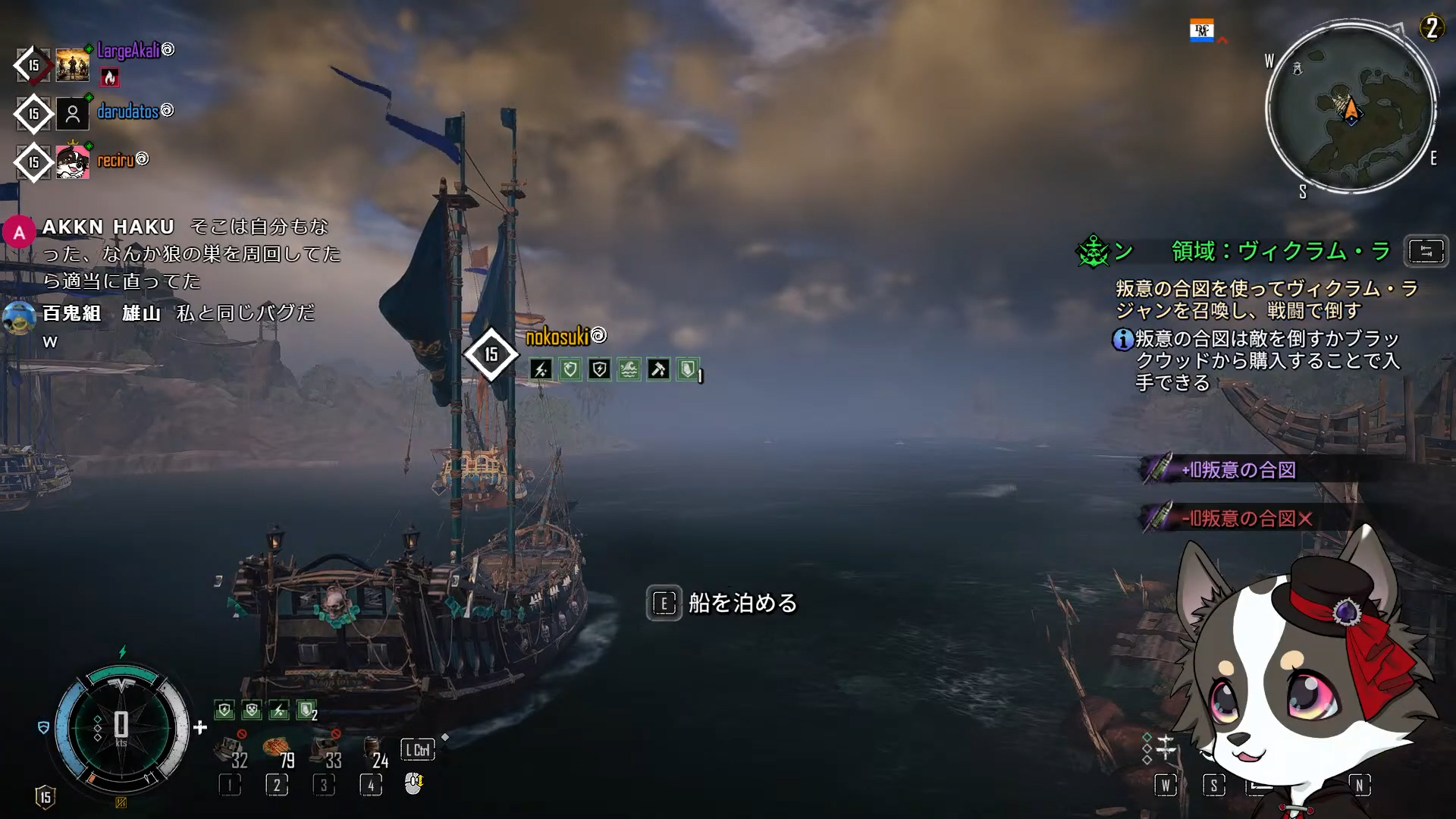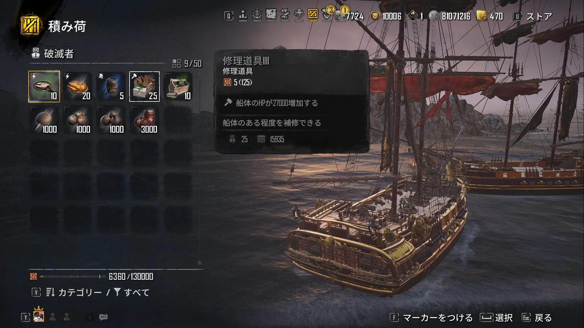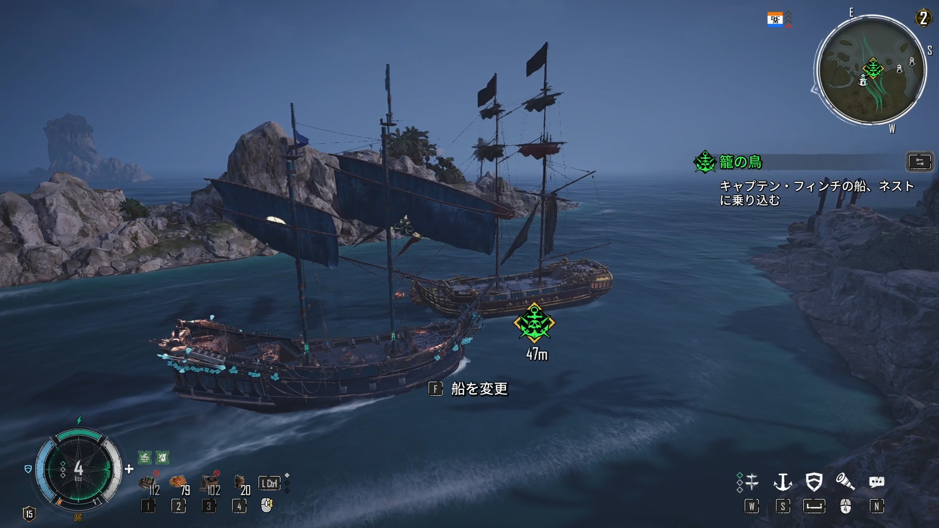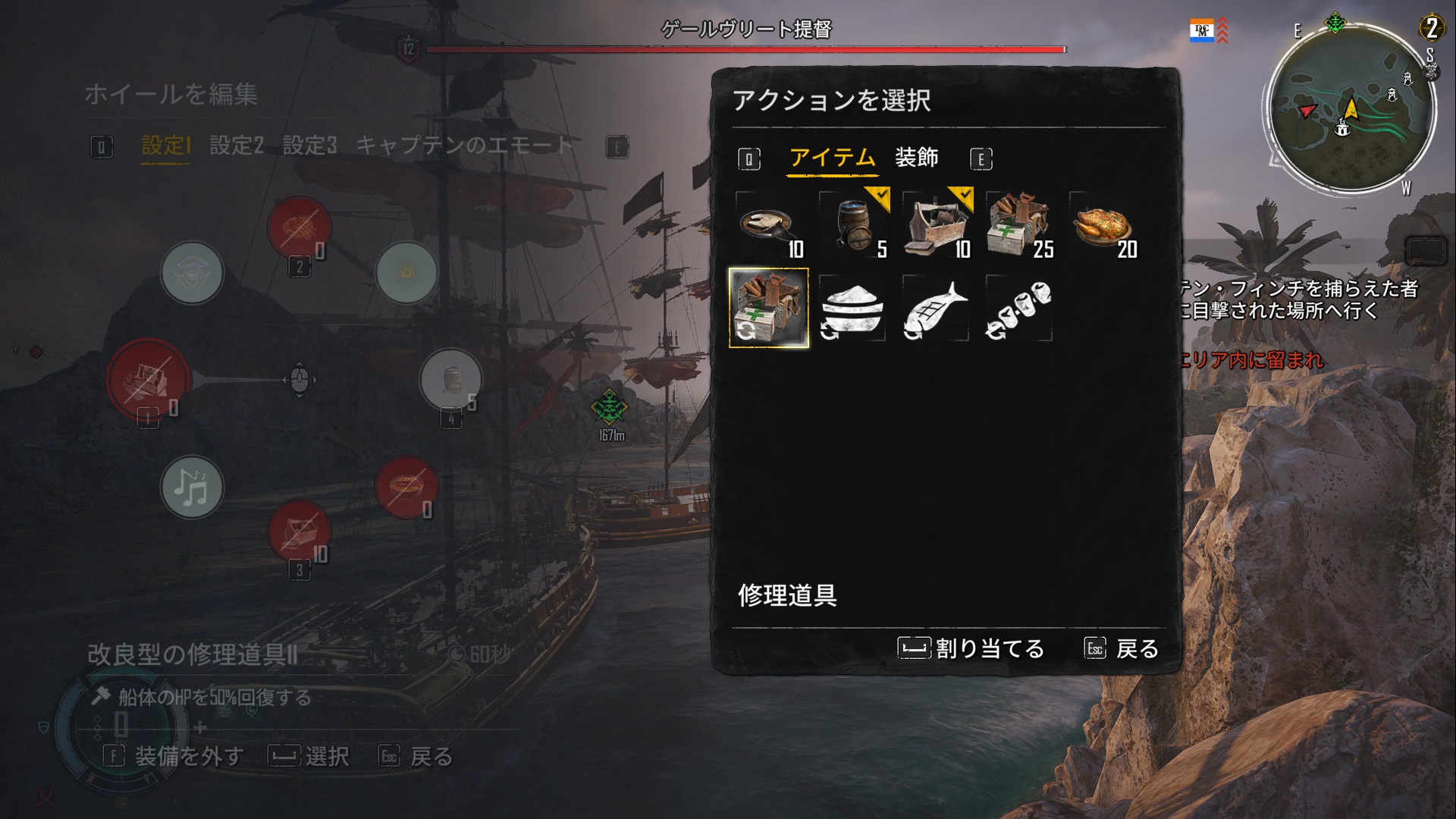 「スループ軍艦」に乗り換えた後は、積み荷が変わっていて(普段ご自身が使っている回復アイテムとは違う)修理道具や食料などのクイックスロットを変更して、戦闘中すぐに回復できるように準備しておこう。