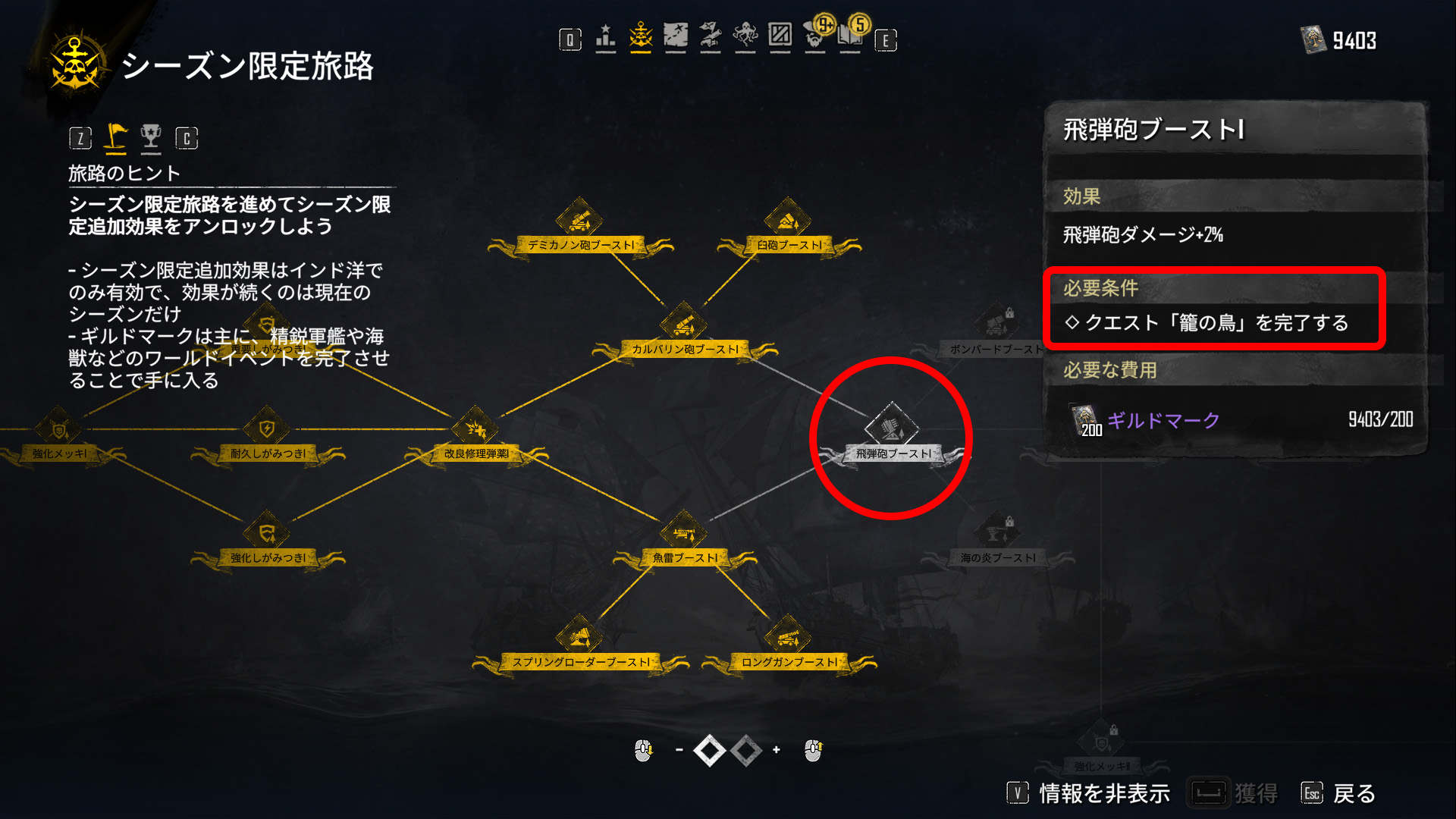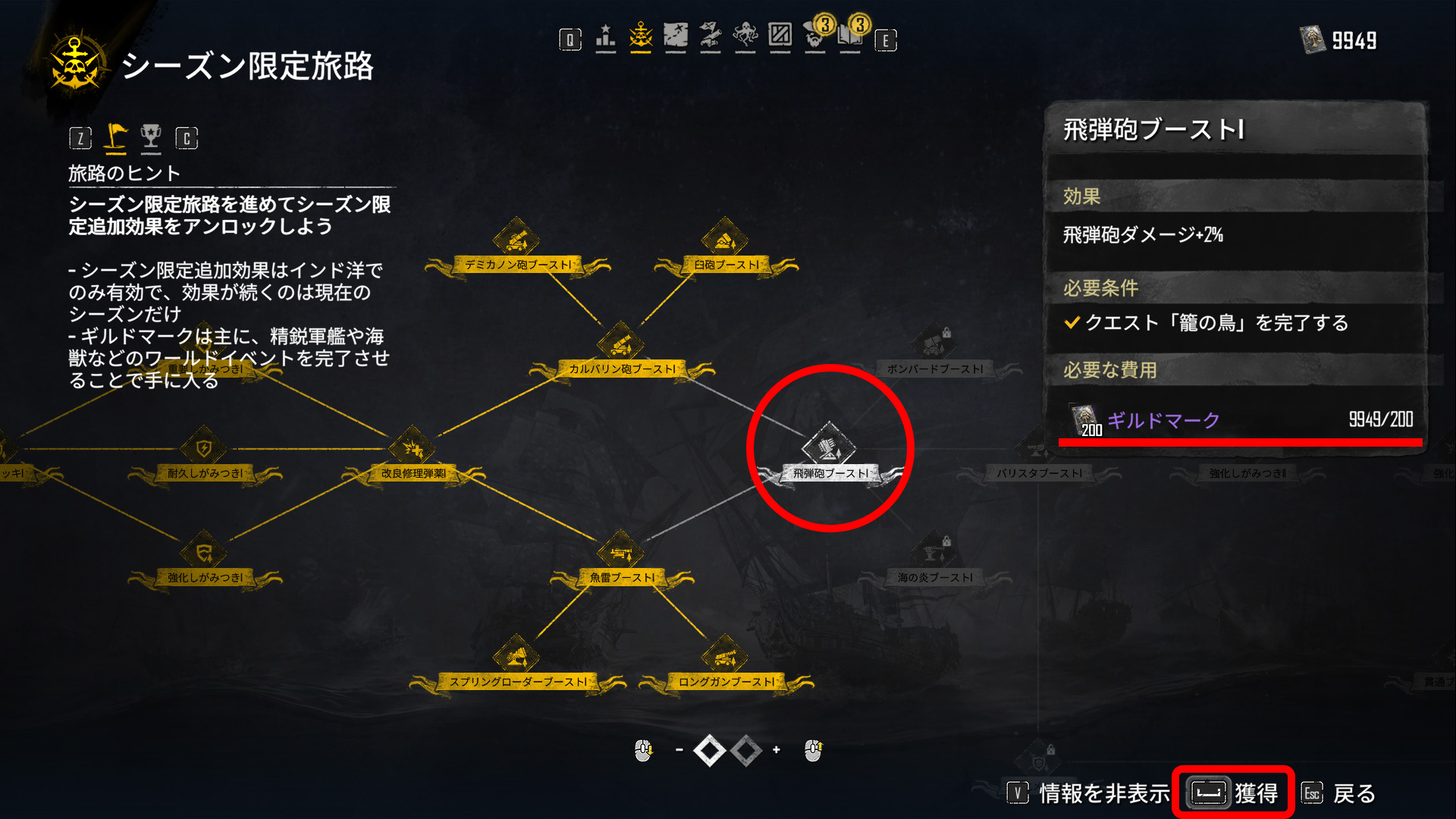 - 画面に「クエスト完了」と出たら「シーズン限定旅路」を開き、獲得したい追加効果を選択し、必要経費のギルドマークが足りている状態で「獲得」を押す。