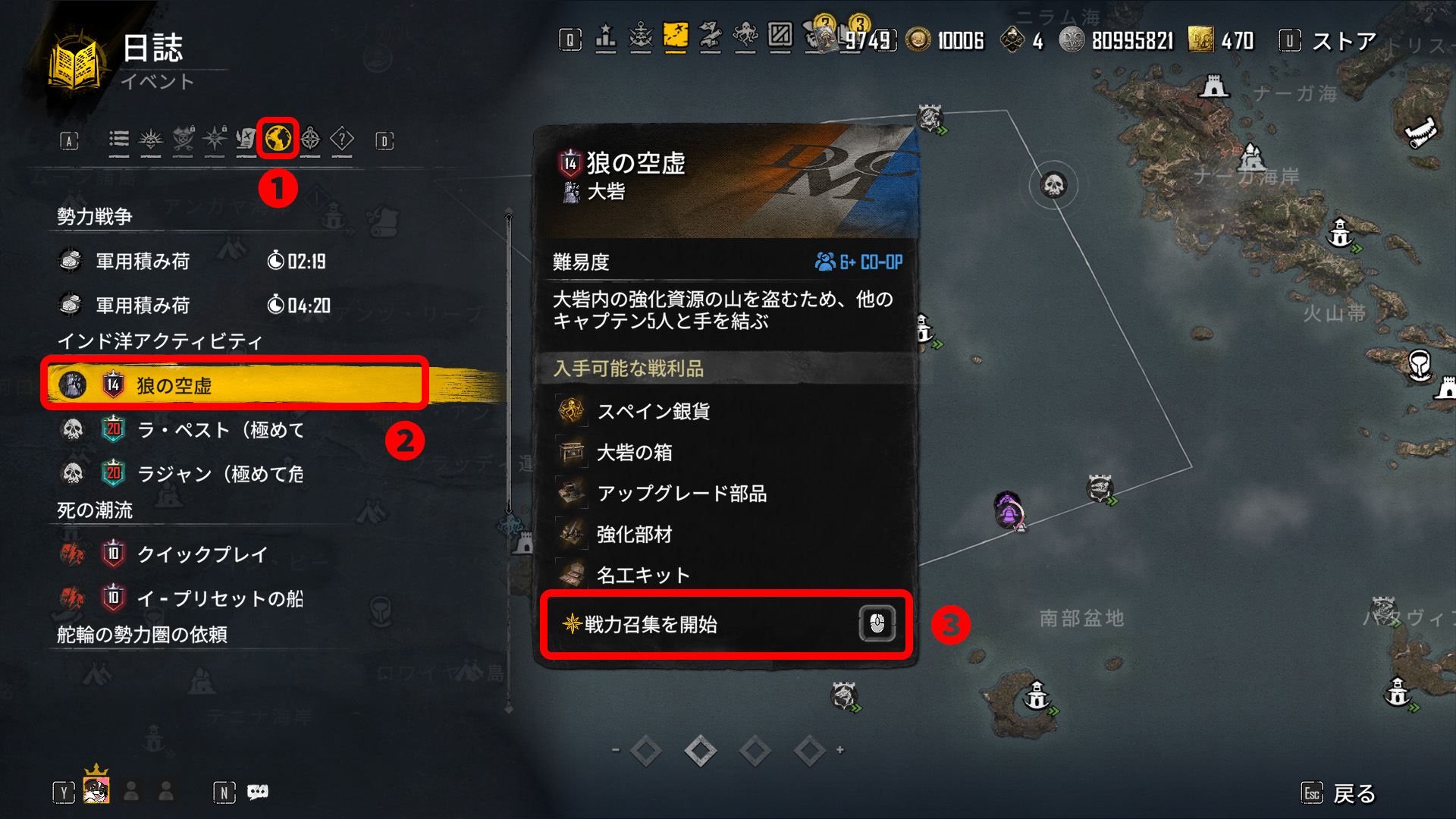 ➥「狼の空虚」は日誌[⌨:Jキー /🎮:タッチパッド > ▢ボタン]のサブタブ🌎から「戦力召集を開始」で参加。