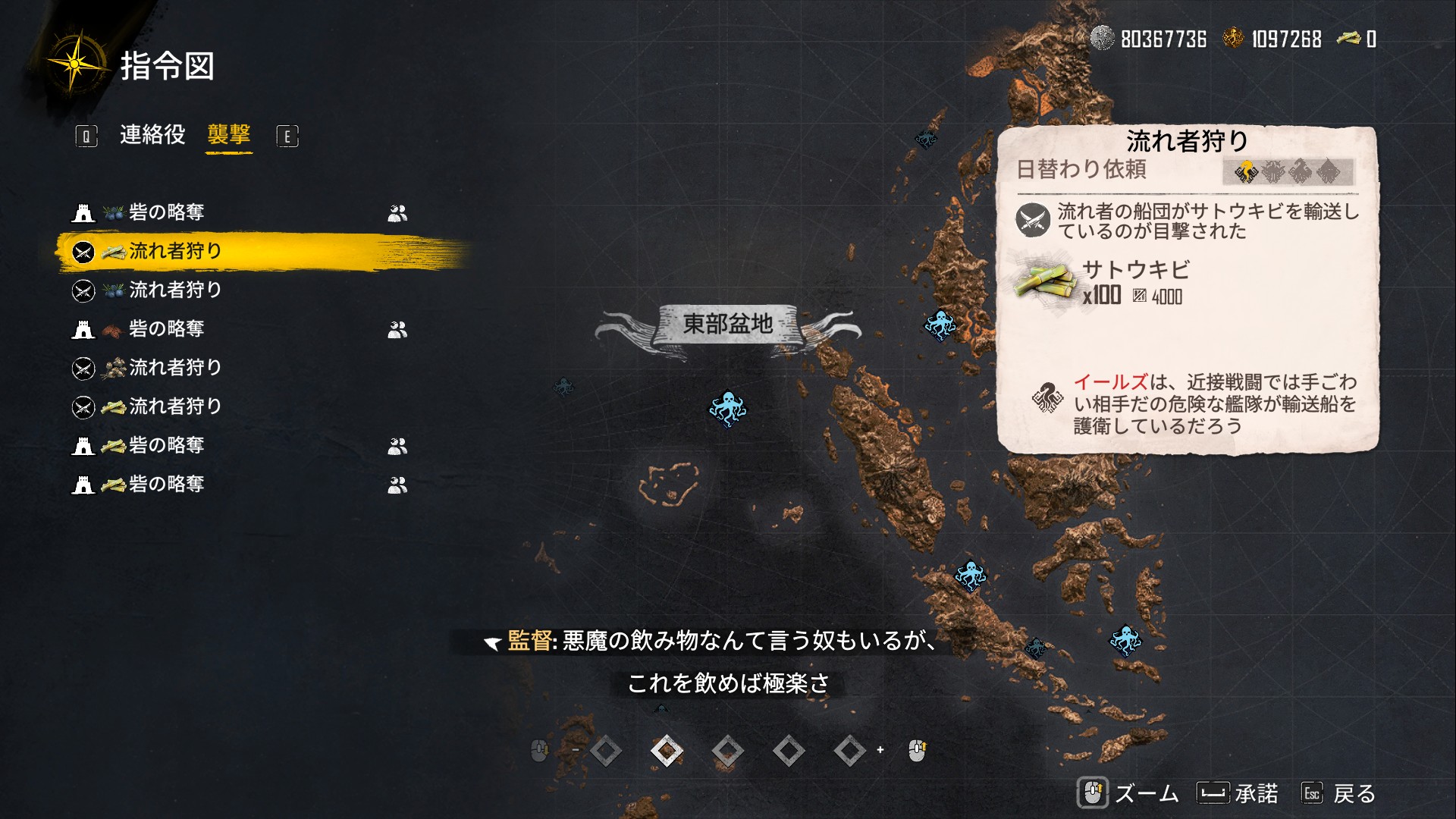 舵輪の品(禁制品)の材料が大量に欲しい場合は、「指令図」の「襲撃」の「砦の略奪」をやることをおすすめします。