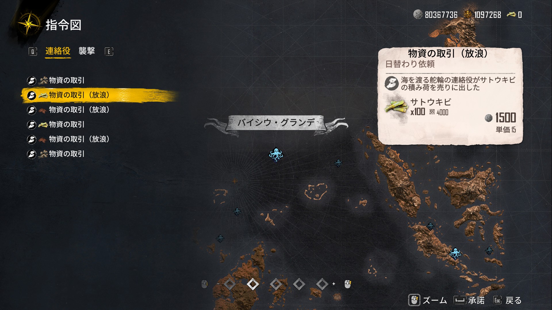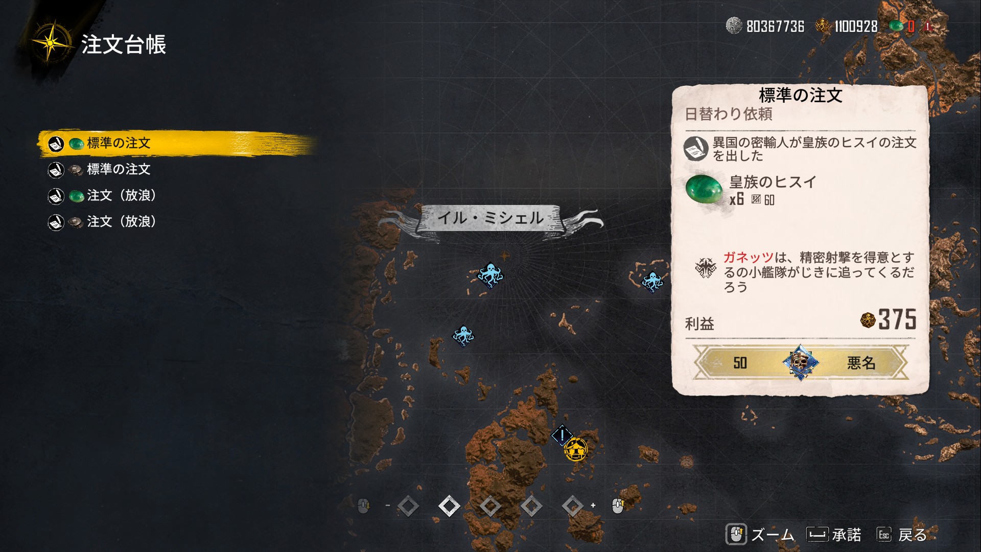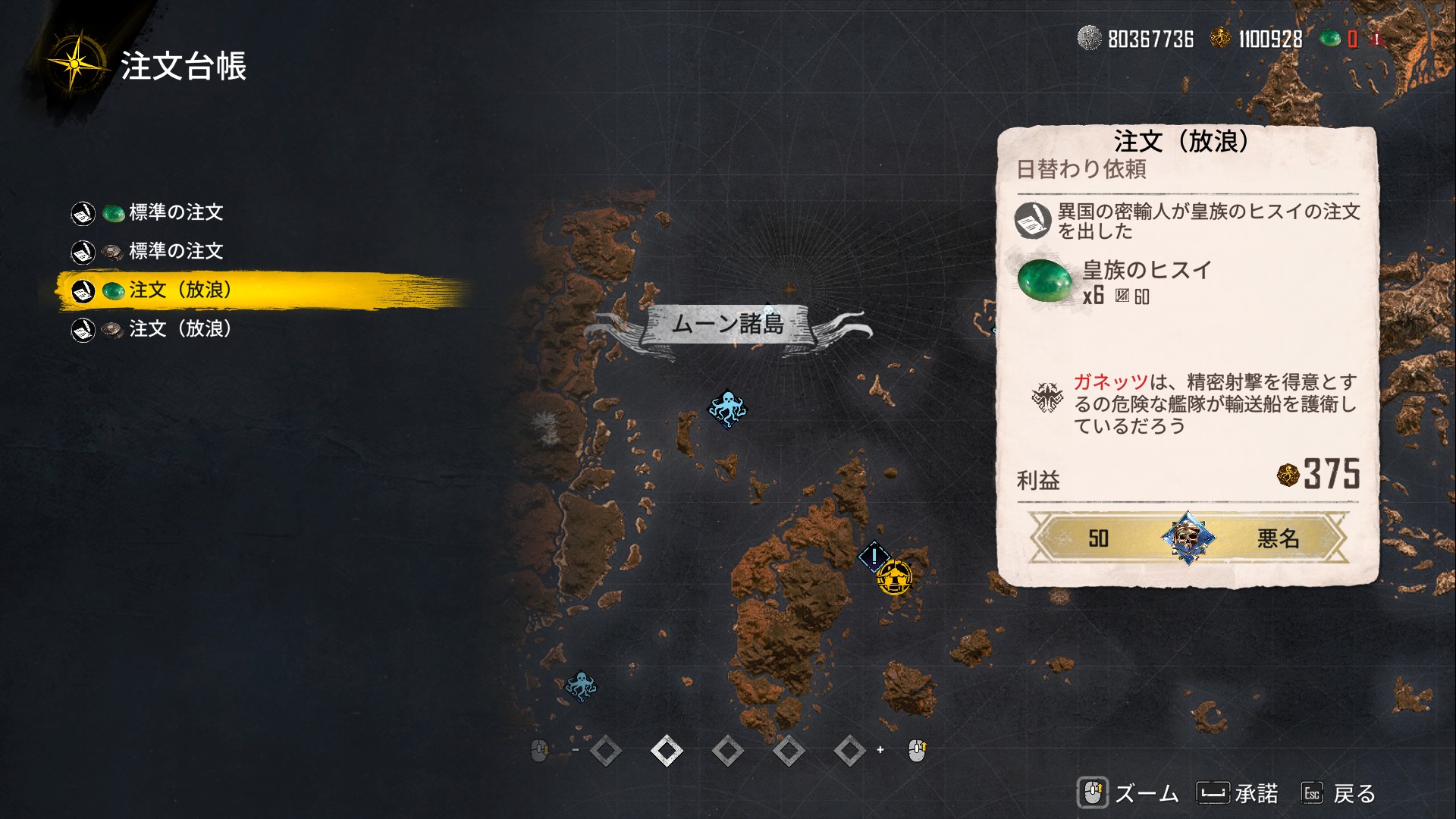 標準の注文 | 指定の舵輪の品(禁制品)を指定の停泊地の「異国の密輸人」に届け、スペイン銀貨を得る |