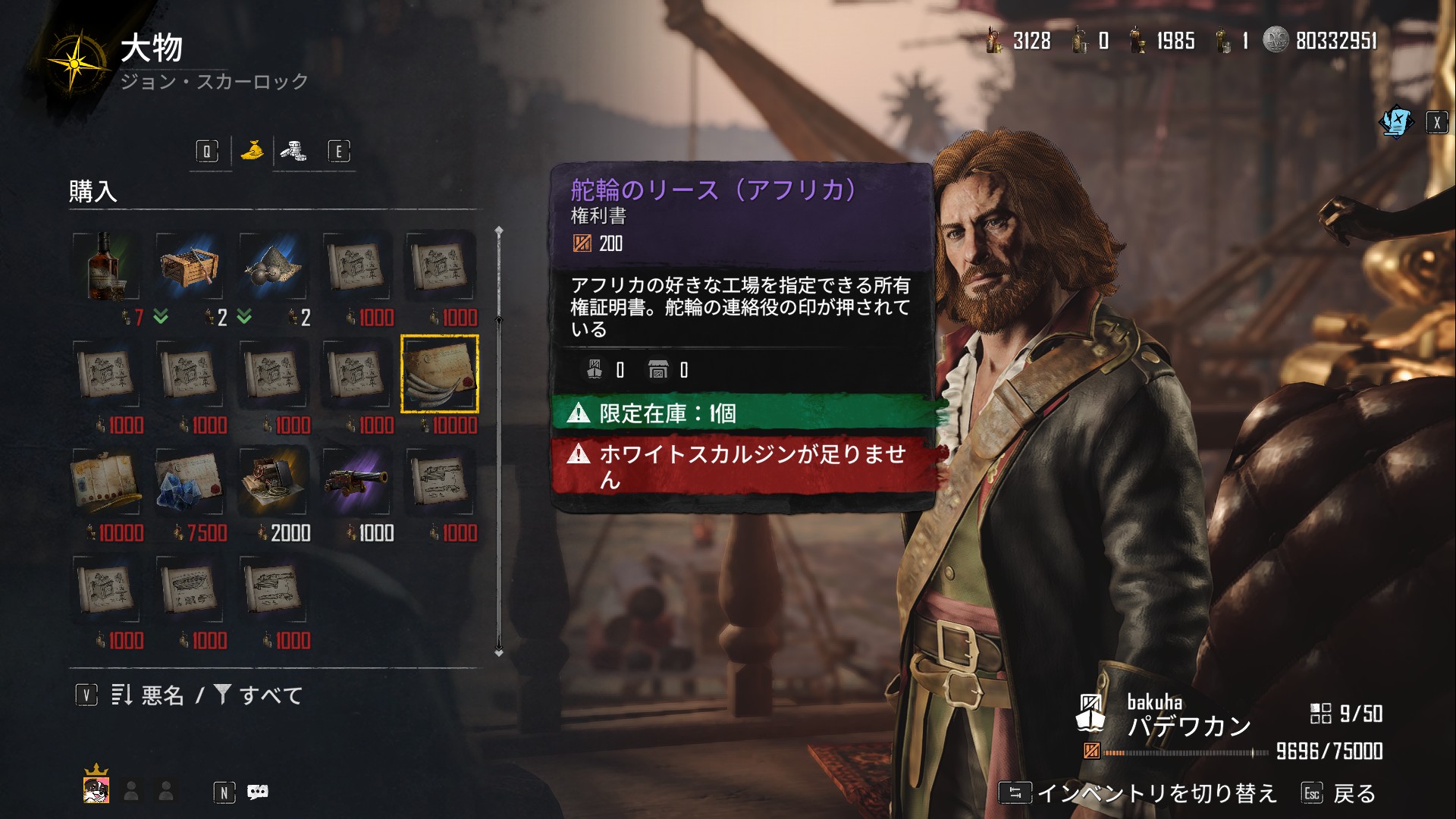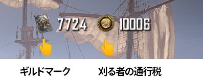 船や武器の材料は闇市場で「スペイン銀貨」で購入するよりもイベント店で「刈る者の通行税」で購入したほうがお得。