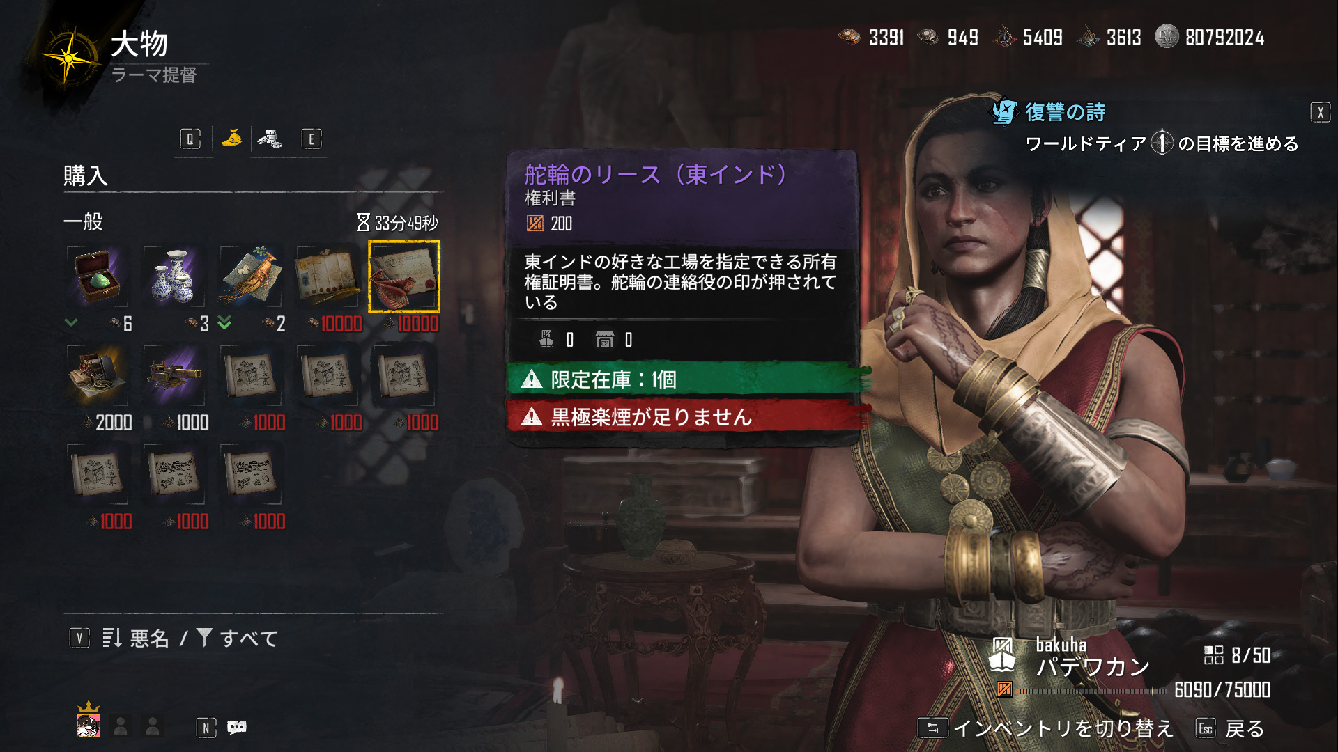 舵輪の品(禁制品)の煙草は、ラーマ提督からアイテムを購入する際の通貨代わりとなる。