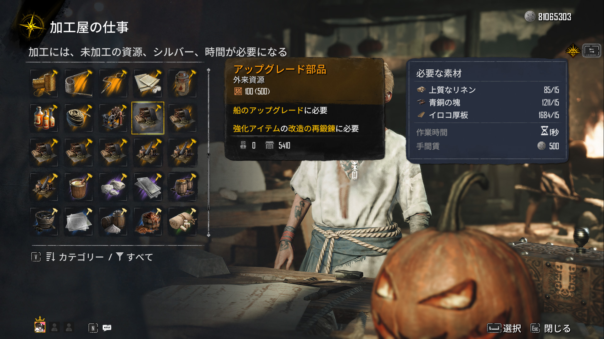 「強化部材」と「アップグレード部品」のレシピは複数あるので、全べてのレシピで加工した後に余った廃止素材は売ってシルバーに変えよう。