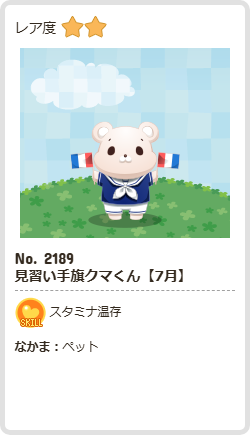 見習い手旗クマくん【7月】 | スタミナ | ペット | ☆2 | 49 | 372 | 157 | 1192 | 9 |