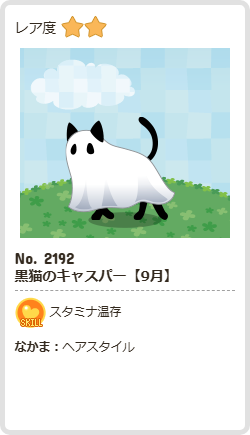 黒猫のキャスパー【9月】 | スタミナ | ヘア | ☆2 | 47 | 357 | 157 | 1192 | 9 |