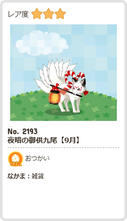 夜暗の御供九尾【9月】 | おつかい | 雑貨 | ☆3 | 51 | 387 | 164 | 1245 | 10 |