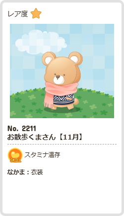 お散歩くまさん【11月】 | スタミナ | 衣装 | ☆1 | 41 | 312 | 154 | 1169 | 8 |