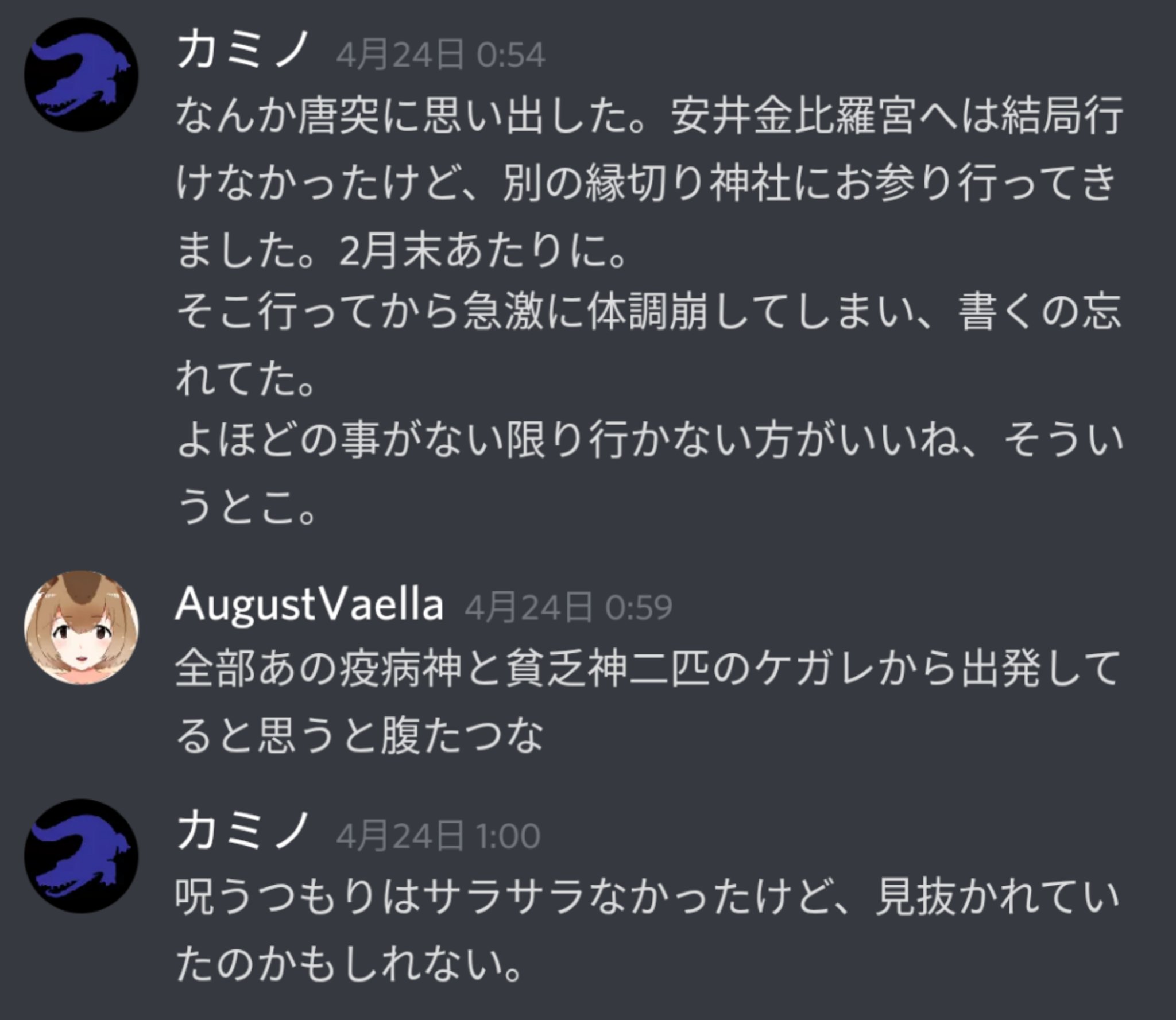 執拗に「縁切り神社行ってきた」を連呼するカミノ