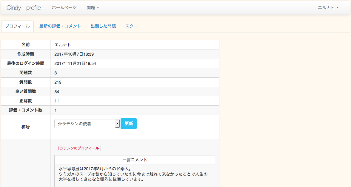 現在表示しているユーザーの出題した問題の一覧が見られます。