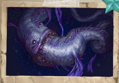 巨大なウロボロスウナギは、生命の気配がないアビスの海溝に単独で佇み、自身の尾を際限なく食らうことで生命を維持している… なんと不可解な生命体だ。その存在を説明できる唯一の仮説は、自身の組織を再生するのに必要なエネルギーよりも、それを消化することで得られるエネルギーの方が多い (おそらくそれは稀な変異なのだろうか?) ということだが… それは全くもって常軌を逸している!このプロセスにはいつか終わりが来るはずではないのか?もしかしたら、私は何かを見落としているのかもしれない… |