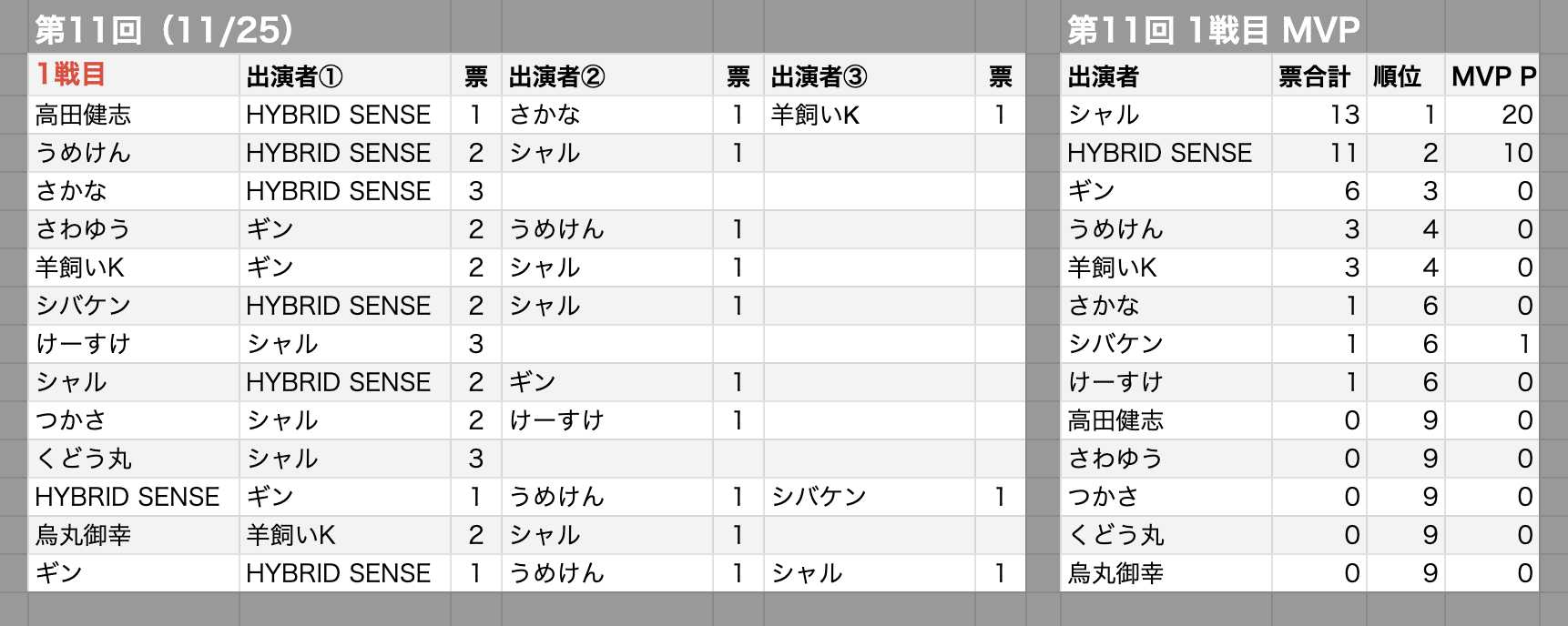 MVP村・MVPポイントの投票先一覧と最終順位
