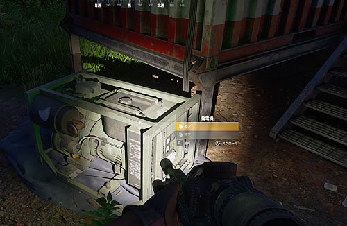 使用場所:予備基地の奥、崖の壕の前にある医療コンテナハウスのキーパッド。なおキーパッド操作前に、コンテナハウス横にある発電機をオンにする必要がある