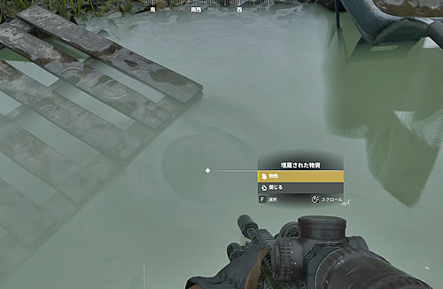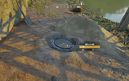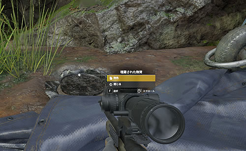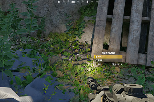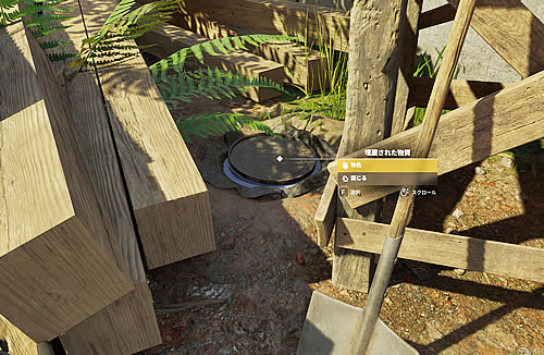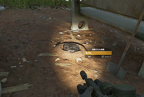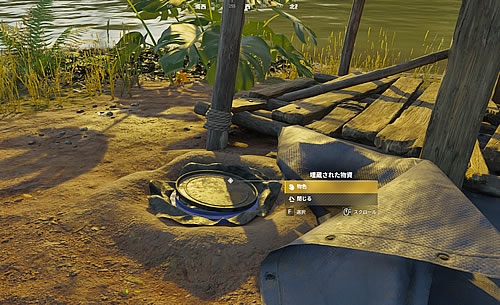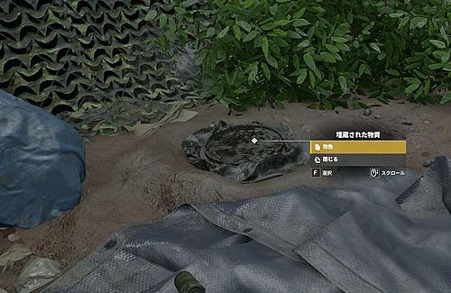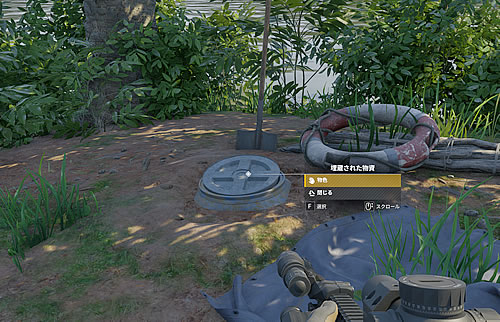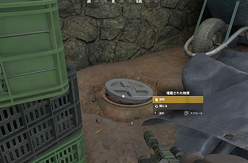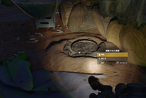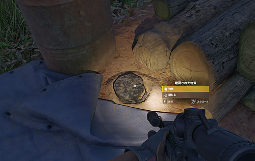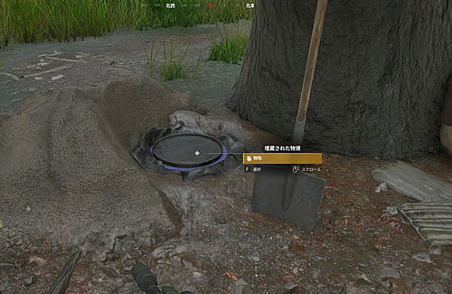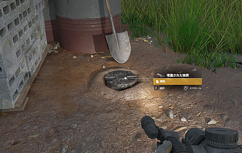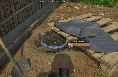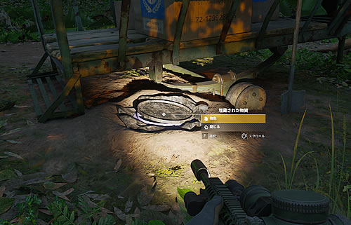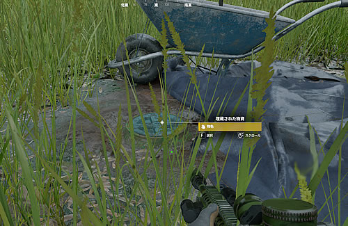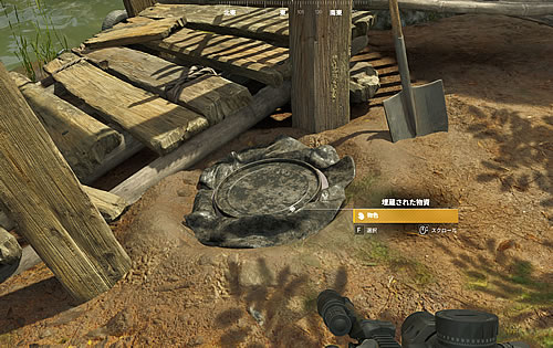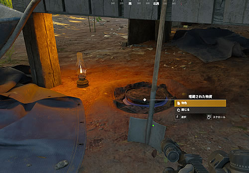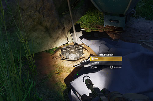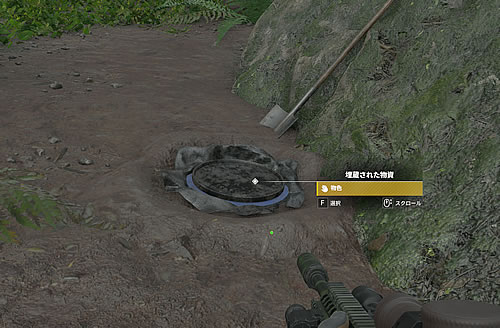 場所:LZアルファ3の南、川沿いの「廃小屋」の横のシートとスコップの間