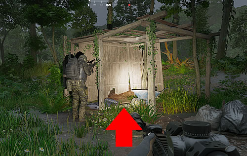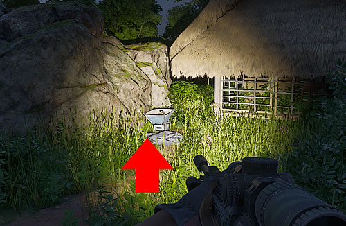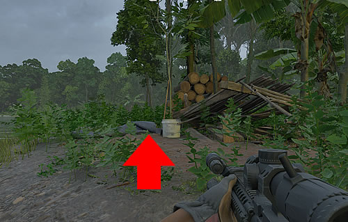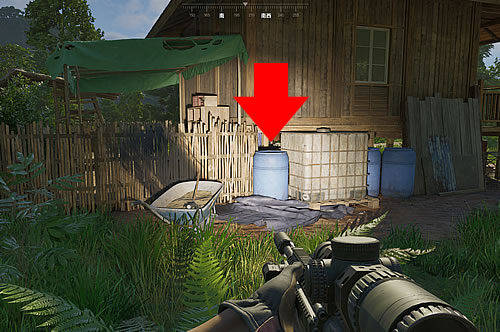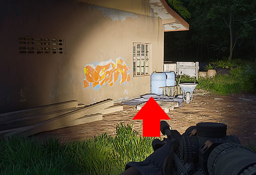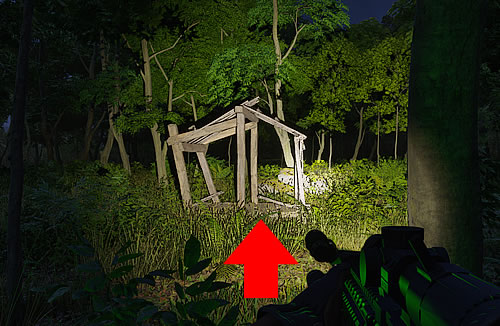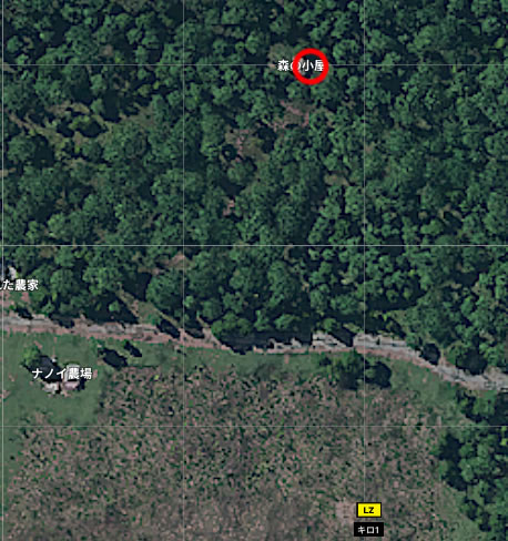 場所:LZキロ3の北、森の中の「森の小屋」の横の青いドラム缶とシートの間