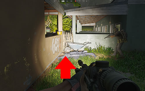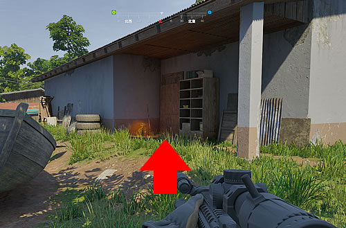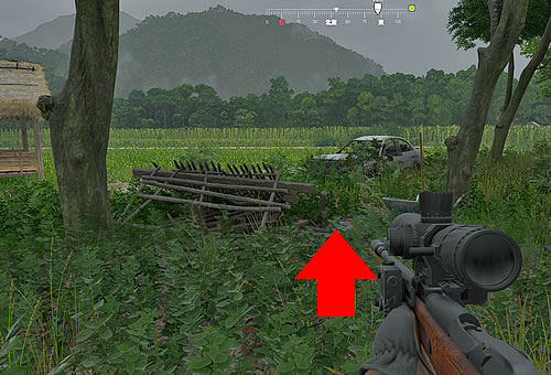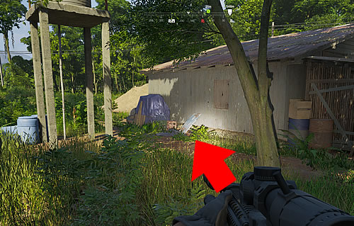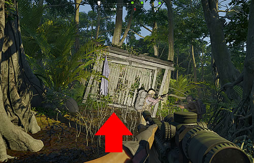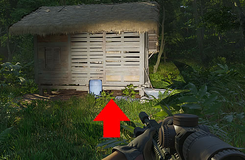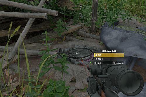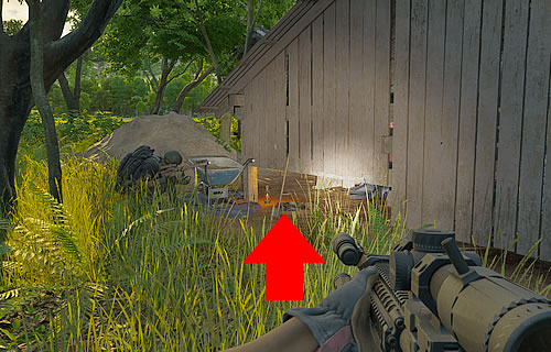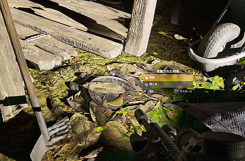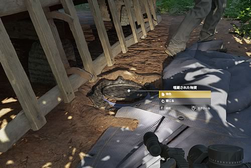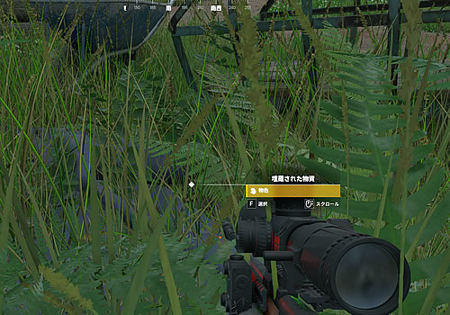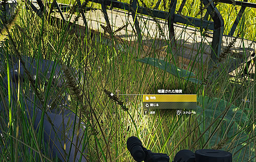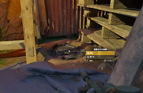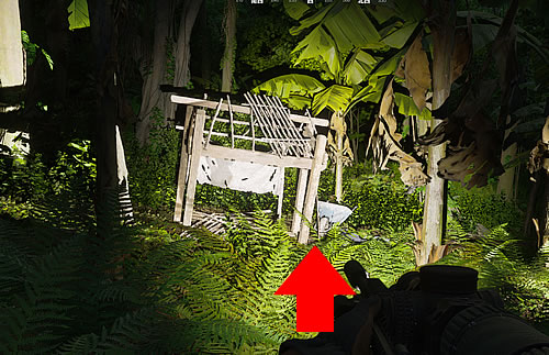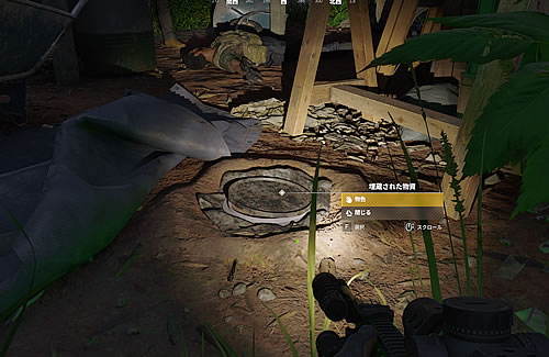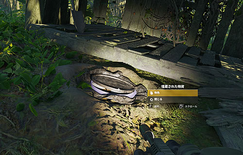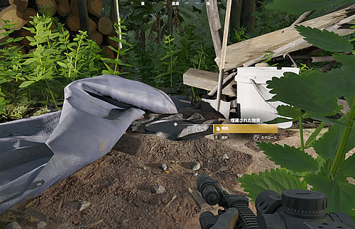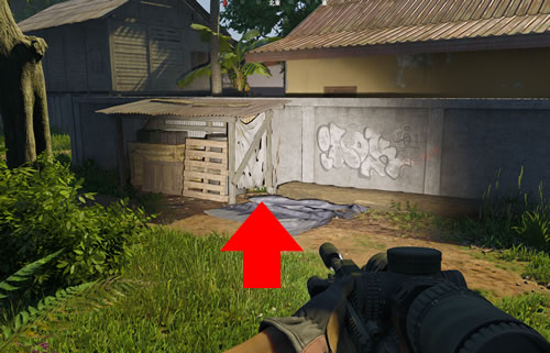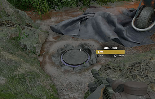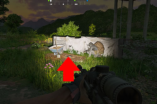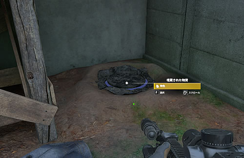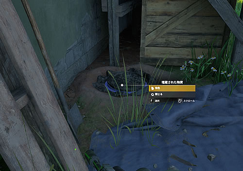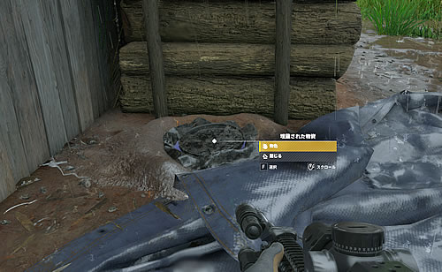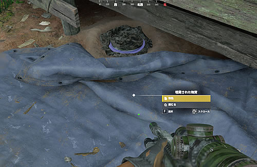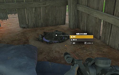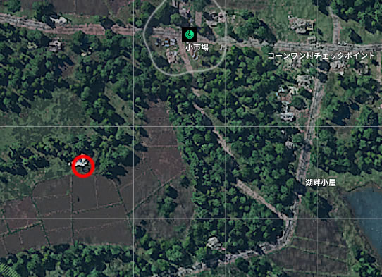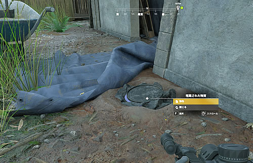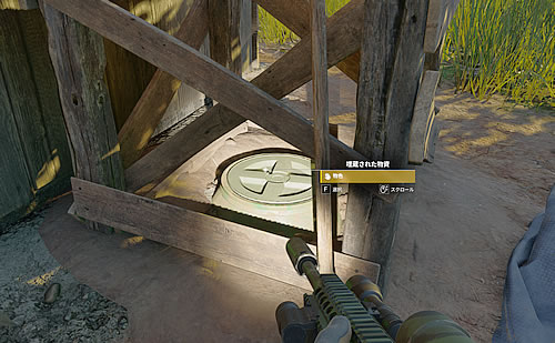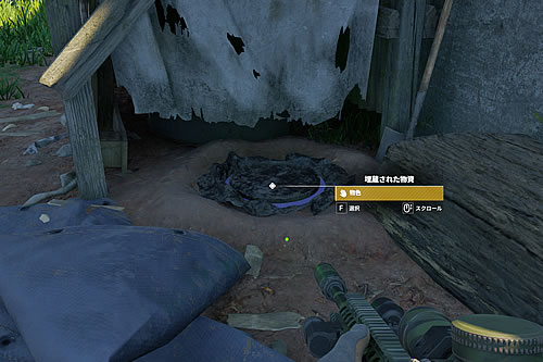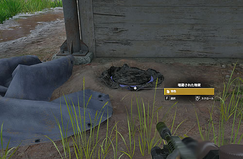 場所:戦闘拠点パンサーの北東、田んぼの脇道沿いにある崩れた小屋とシートの間