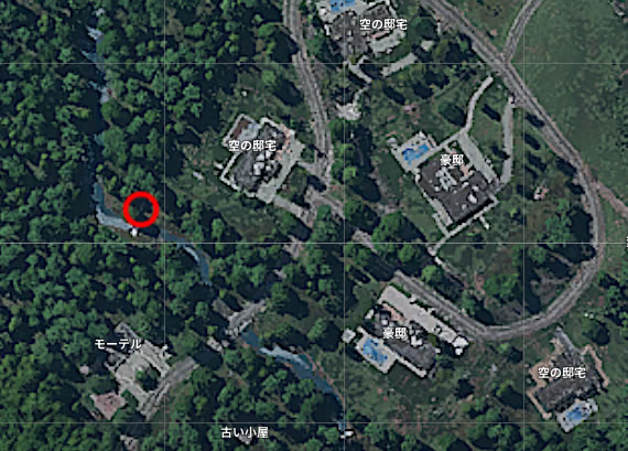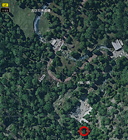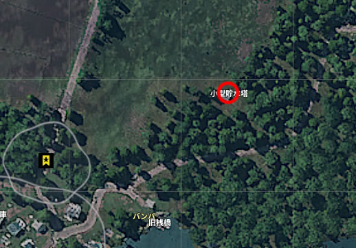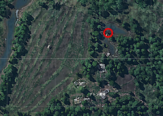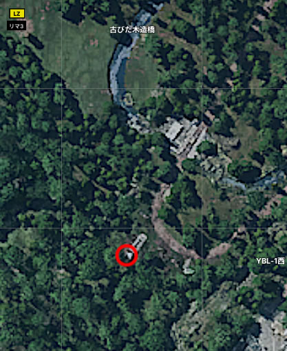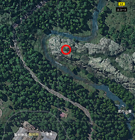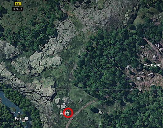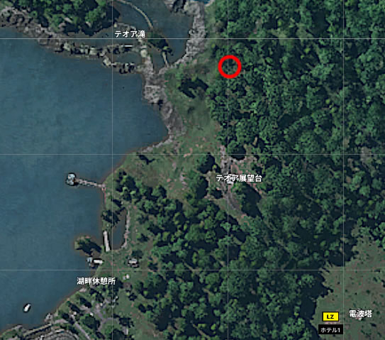 場所:「テオア滝」の橋の東、狙撃ポイントとしても使う丘を登った所の裏にある壊れた櫓と一輪車の間、大きさは5×9マス