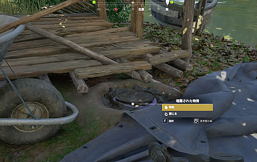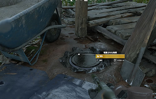 場所:「崩れかけた避難所」の崩れた小屋と一輪車の間
