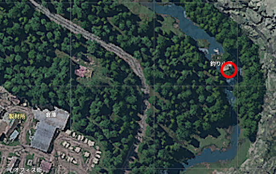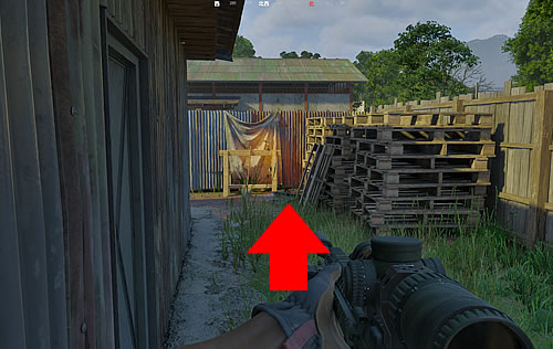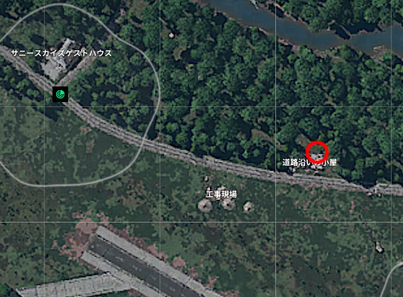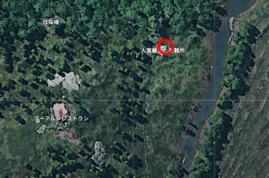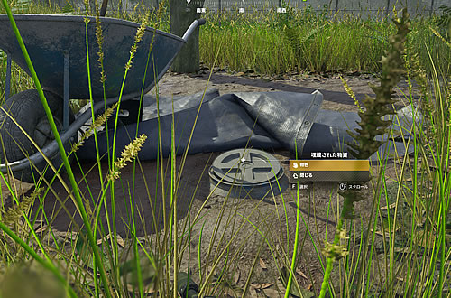 場所:「釣り小屋」の建物の横、一輪車とシートの間 ※4月16日時点では判定がズレていて手前のシートを見る感じです