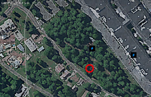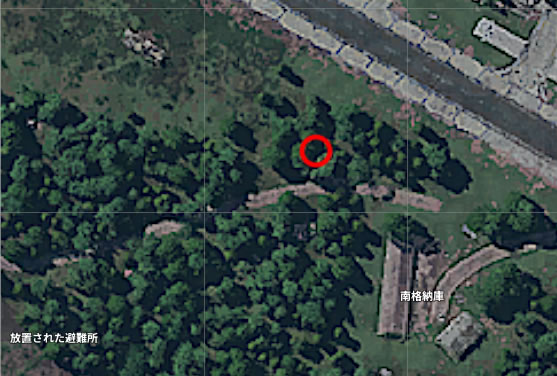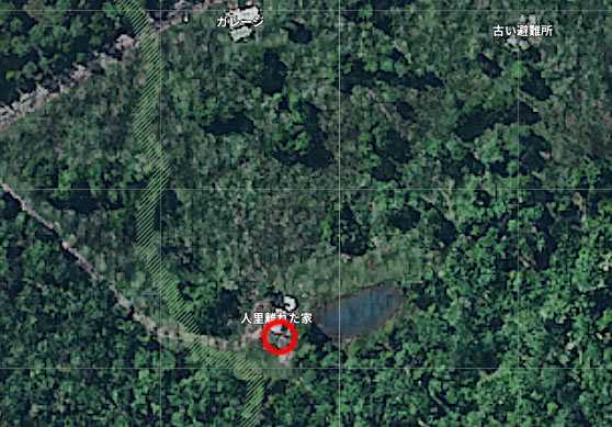 場所:「旧区画」の西にある木々と建物間、壁際の小屋とシートの間