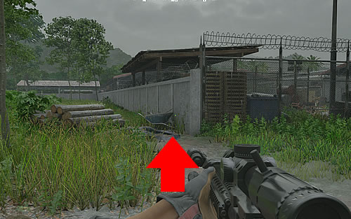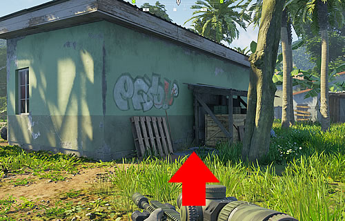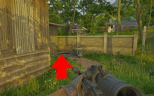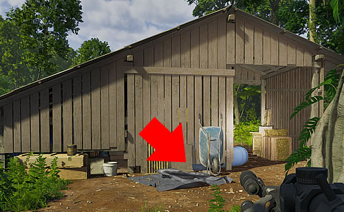 場所:LZゴルフ1の北西、「農場の家」と「ガソリンスタンド」の間の建物の車庫裏の一輪車の横