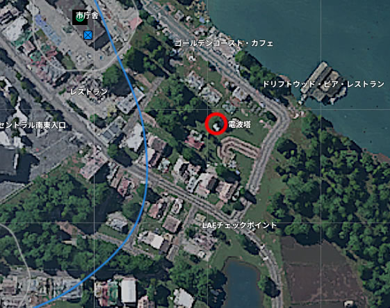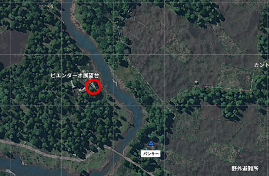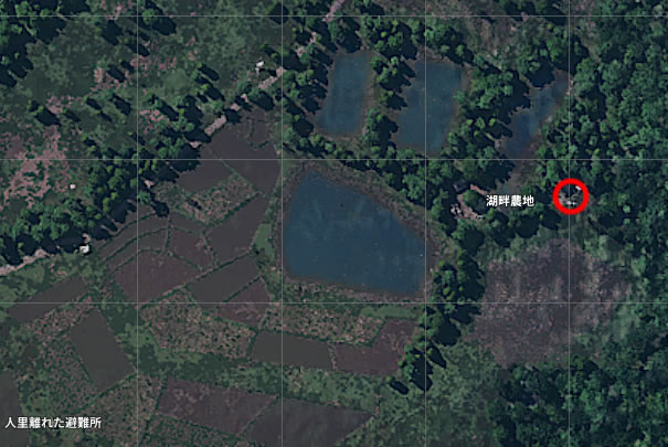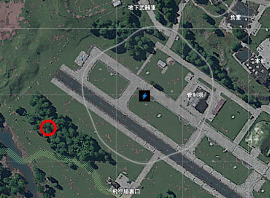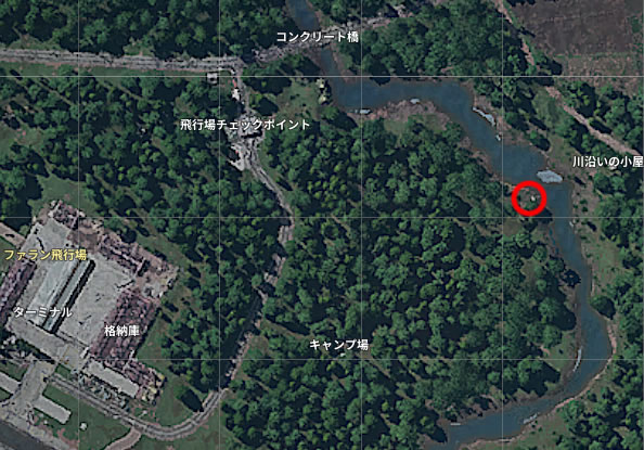 場所:飛行場の東の川沿いにある壊れた櫓とシートの間