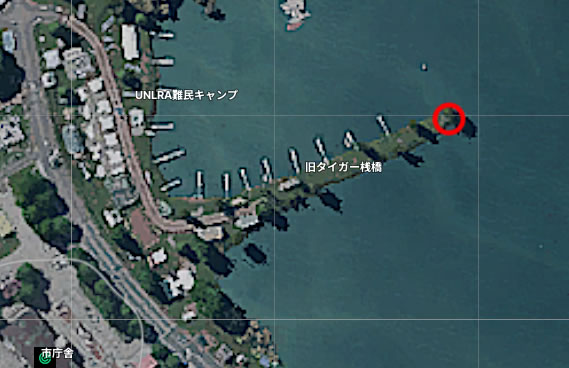 場所:「旧タイガー桟橋」の先端、二本のヤシの木の下のスコップの横、大きさは5×9マス