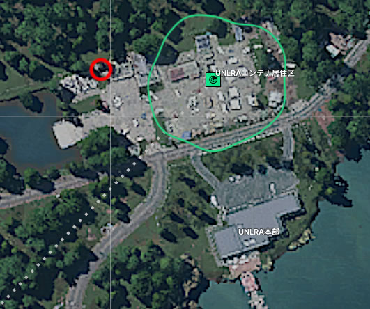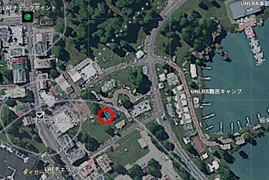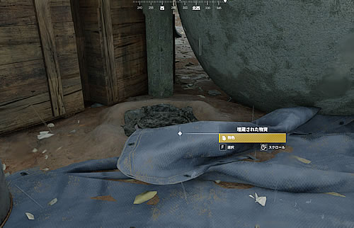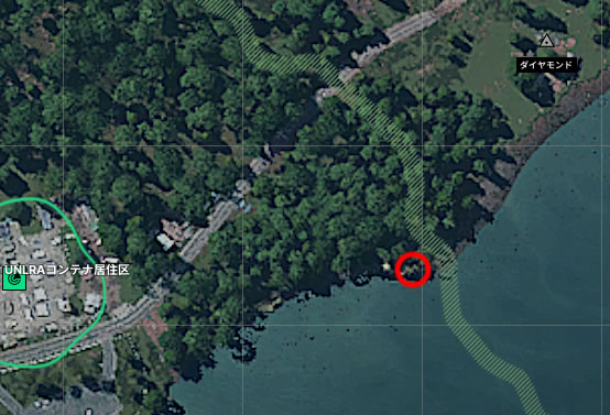 場所:戦闘拠点ダイヤモンドと「UNLRA本部」との間、海沿いにある大きな岩の間のパレットとシートの間