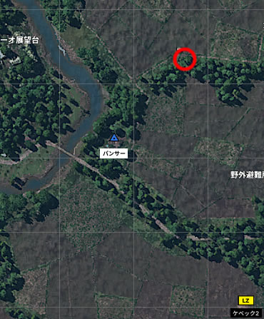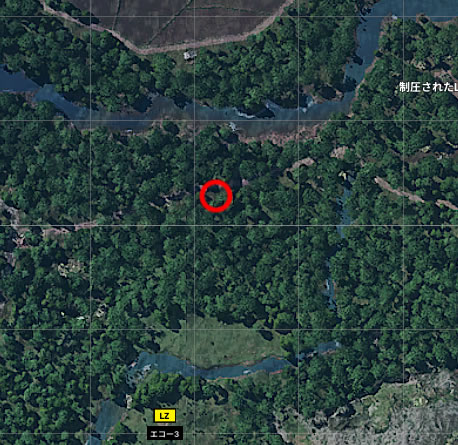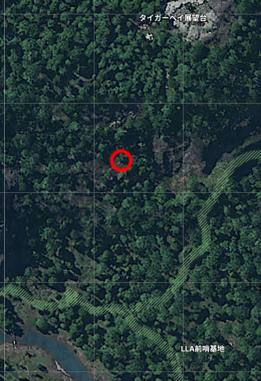 場所:LZエコー3の南の山道から登り、その崖の西側先端にある1本の枯れ木の根本