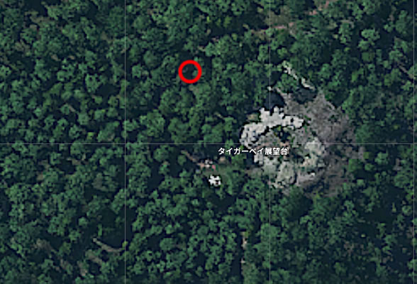 場所:「タイガーベイ展望台」に行く山道のベンチがある角、大きな木と板の間