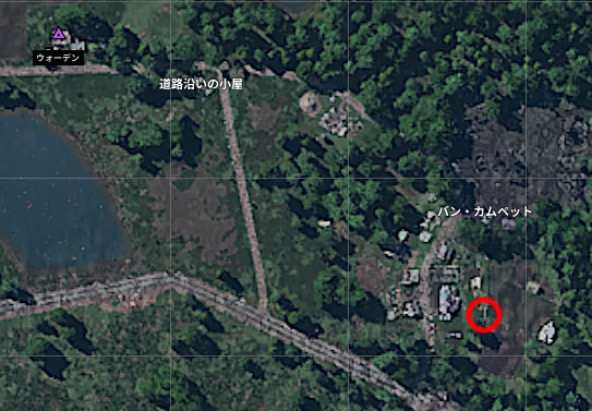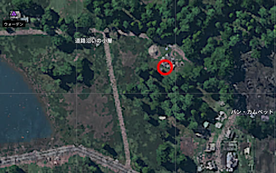 場所:コーンワン村の南西、池の脇にある「人里離れた家」の壁とシートの間、大きさは2×6マス