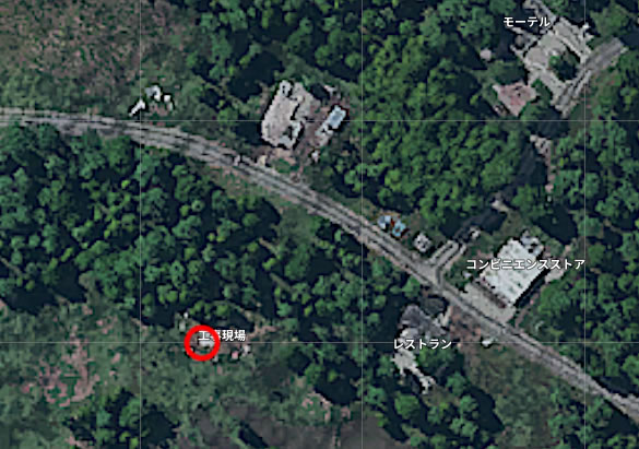場所:ベースキャンプ近くのレストランの裏にある「工事現場」の角、ドラム缶とスコップの横、大きさは2×6マス