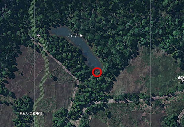 場所:「ノンブー池の南のほとり、ドラム缶と丸太の間、大きさは2×6マス